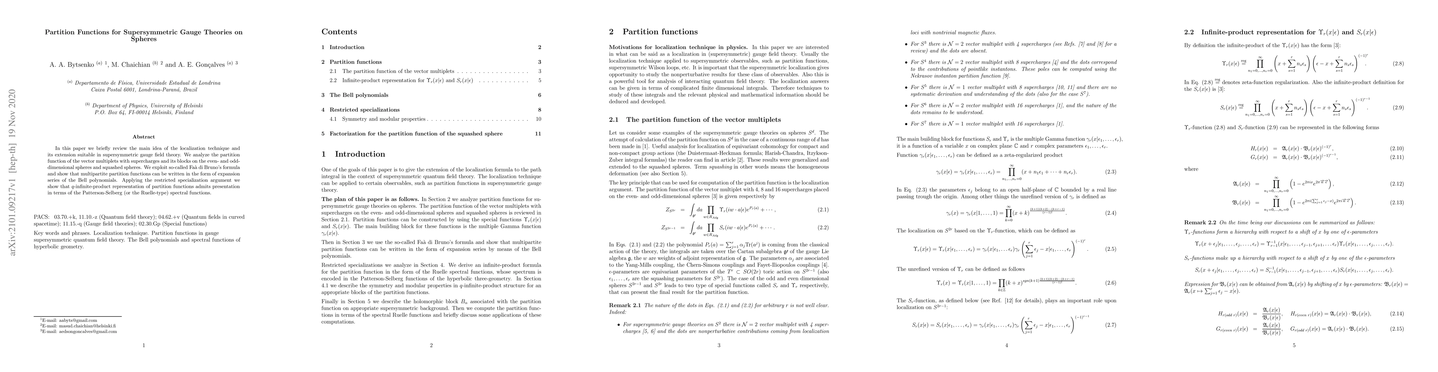 This paper reviews the localization technique for supersymmetric gauge theories and analyzes the partition functions of vector multiplets on various spheres. It demonstrates that multipartite partition functions can be expressed using Bell polynomials and shows that their $q$-infinite-product representation can be presented in terms of Patterson-Selberg spectral functions.