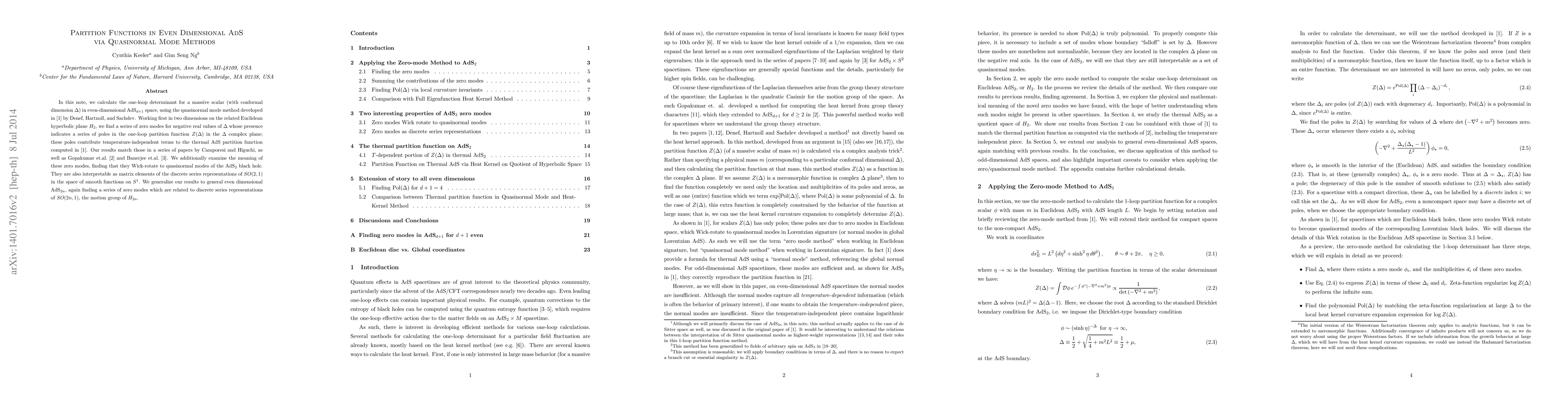 In this note, we calculate the one-loop determinant for a massive scalar (with conformal dimension $\Delta$) in even-dimensional AdS$_{d+1}$ space, using the quasinormal mode method developed in arXiv:0908.2657 by Denef, Hartnoll, and Sachdev. Working first in two dimensions on the related Euclidean hyperbolic plane $H_2$, we find a series of zero modes for negative real values of $\Delta$ whose presence indicates a series of poles in the one-loop partition function $Z(\Delta)$ in the $\Delta$ complex plane; these poles contribute temperature-independent terms to the thermal AdS partition function computed in arXiv:0908.2657. Our results match those in a series of papers by Camporesi and Higuchi, as well as Gopakumar et al. in arXiv:1103.3627 and Banerjee et al. in arXiv:1005.3044. We additionally examine the meaning of these zero modes, finding that they Wick-rotate to quasinormal modes of the AdS$_2$ black hole. They are also interpretable as matrix elements of the discrete series representations of $SO(2,1)$ in the space of smooth functions on $S^1$. We generalize our results to general even dimensional AdS$_{2n}$, again finding a series of zero modes which are related to discrete series representations of $SO(2n,1)$, the motion group of $H_{2n}$.