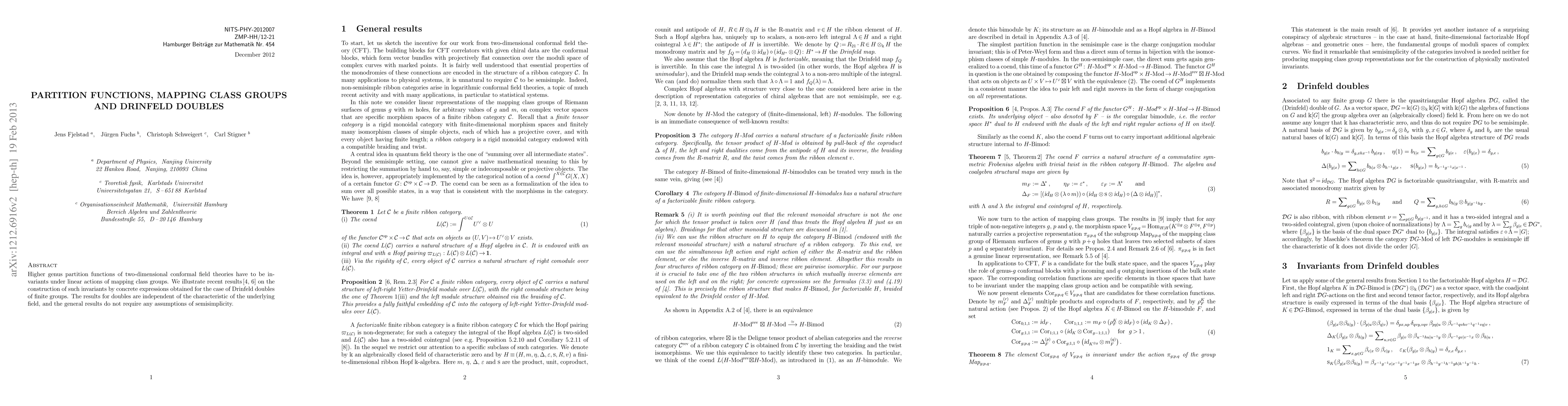 Higher genus partition functions of two-dimensional conformal field theories have to be invariants under linear actions of mapping class groups. We illustrate recent results [4,6] on the construction of such invariants by concrete expressions obtained for the case of Drinfeld doubles of finite groups. The results for doubles are independent of the characteristic of the underlying field, and the general results do not require any assumptions of semisimplicity.