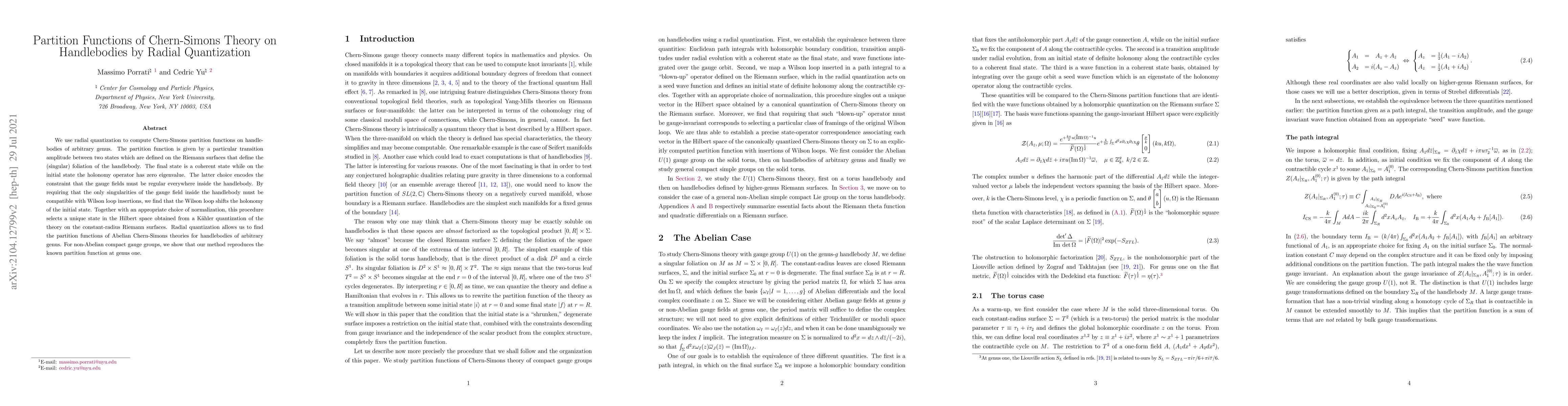 This paper computes Chern-Simons partition functions on handlebodies using radial quantization, finding a unique state in the Hilbert space that satisfies the gauge field regularity constraint. The method reproduces known partition functions for non-Abelian gauge groups at genus one.