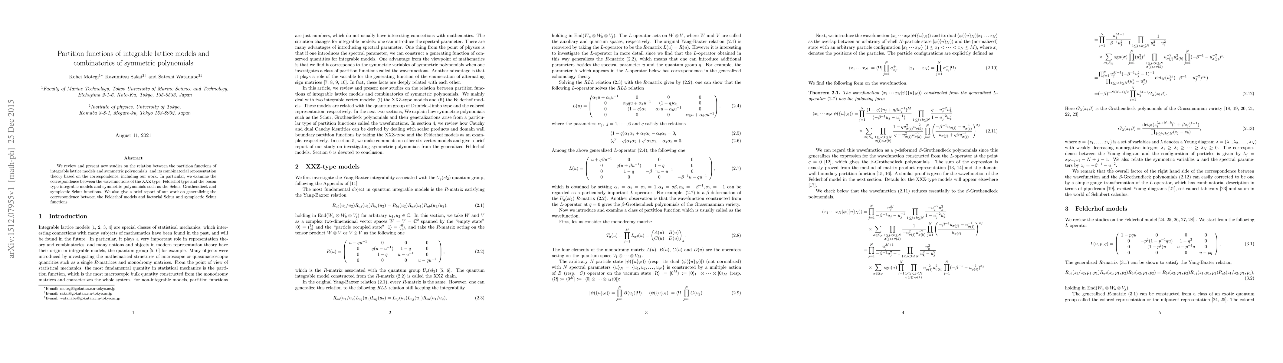 This paper reviews the connection between partition functions of integrable lattice models and symmetric polynomials, focusing on the combinatorial representation theory. It explores the correspondence between wavefunctions of various integrable models and symmetric polynomials, including Schur, Grothendieck, and symplectic Schur functions, and reports on new generalizations of this correspondence.