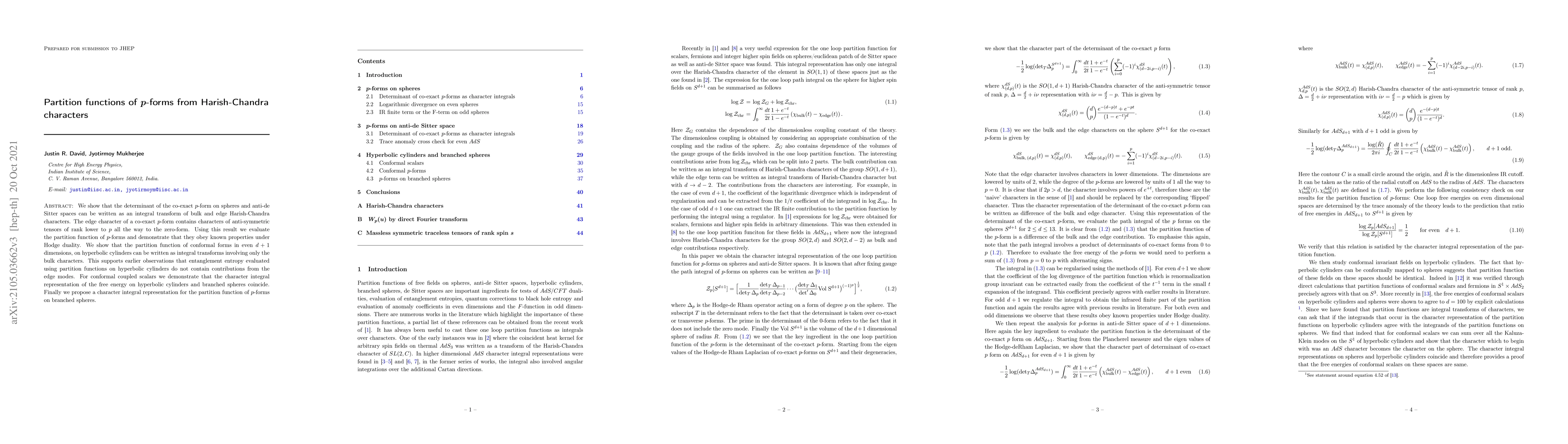 We show that the determinant of the co-exact $p$-form on spheres and anti-deSitter spaces can be written as an integral transform of bulk and edge Harish-Chandra characters. The edge character of a co-exact $p$-form contains characters of anti-symmetric tensors of rank lower to $p$ all the way to the zero-form. Using this result we evaluate the partition function of $p$-forms and demonstrate that they obey known properties under Hodge duality. We show that partition function of conformal forms in even $d+1$ dimensions, on hyperbolic cylinders can be written as integral transforms involving only the bulk characters. This supports earlier observations that entanglement entropy evaluated using partition functions on hyperbolic cylinders do not contain contributions from the edge modes. For conformal coupled scalars we demonstrate that the character integral representation of the free energy on hyperbolic cylinders and branched spheres coincide. Finally we propose a character integral representation for the partition function of $p$-forms on branched spheres.