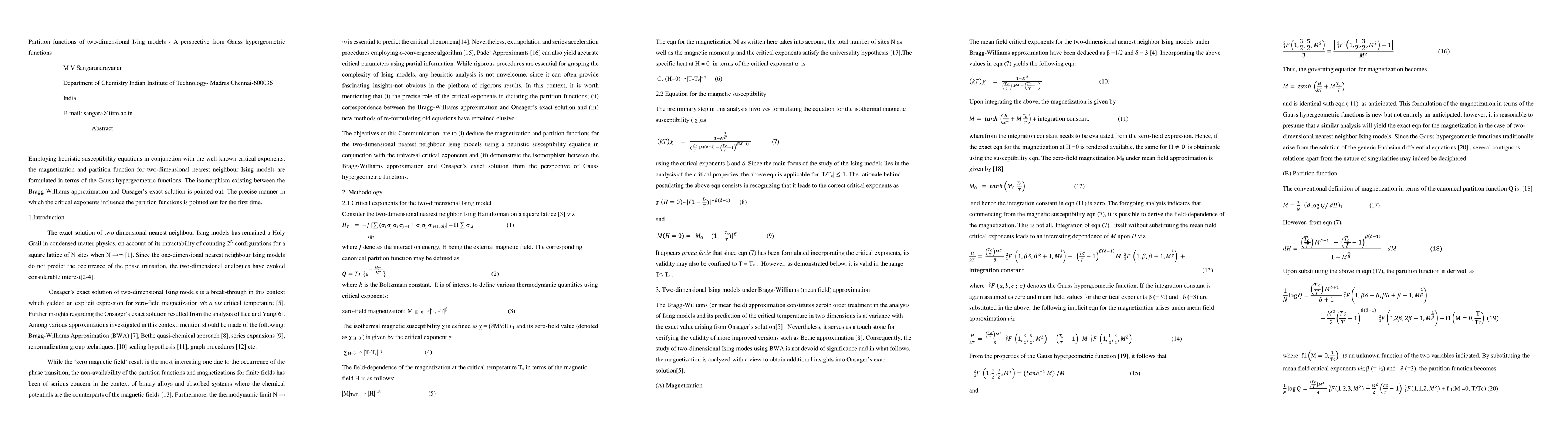 Employing heuristic susceptibility equations in conjunction with the well-known critical exponents, the magnetization and partition function for two-dimensional nearest neighbour Ising models are formulated in terms of the Gauss hypergeometric functions. The isomorphism existing between the Bragg-Williams approximation and the exact solution of Onsager is pointed out. The precise manner in which the critical exponents influence the partition functions is pointed out.