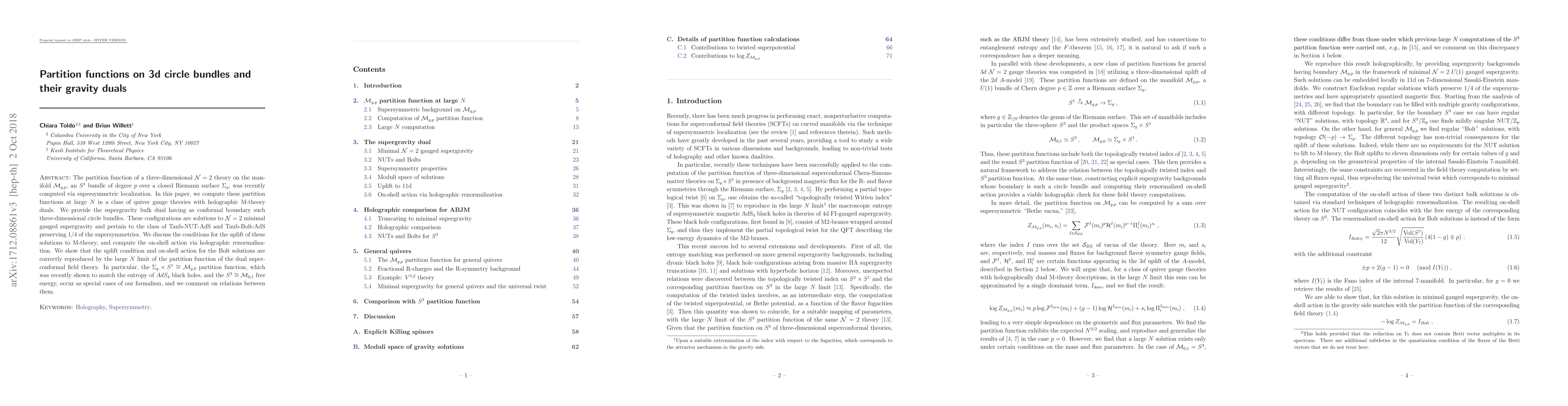 The partition function of a three-dimensional $\mathcal{N} =2$ theory on the manifold $\mathcal{M}_{g,p}$, an $S^1$ bundle of degree $p$ over a closed Riemann surface $\Sigma_g$, was recently computed via supersymmetric localization. In this paper, we compute these partition functions at large $N$ in a class of quiver gauge theories with holographic M-theory duals. We provide the supergravity bulk dual having as conformal boundary such three-dimensional circle bundles. These configurations are solutions to $\mathcal{N}=2$ minimal gauged supergravity and pertain to the class of Taub-NUT-AdS and Taub-Bolt-AdS preserving $1/4$ of the supersymmetries. We discuss the conditions for the uplift of these solutions to M-theory, and compute the on-shell action via holographic renormalization. We show that the uplift condition and on-shell action for the Bolt solutions are correctly reproduced by the large $N$ limit of the partition function of the dual superconformal field theory. In particular, the $\Sigma_g \times S^1 \cong \mathcal{M}_{g,0}$ partition function, which was recently shown to match the entropy of $AdS_4$ black holes, and the $S^3 \cong \mathcal{M}_{0,1}$ free energy, occur as special cases of our formalism, and we comment on relations between them.