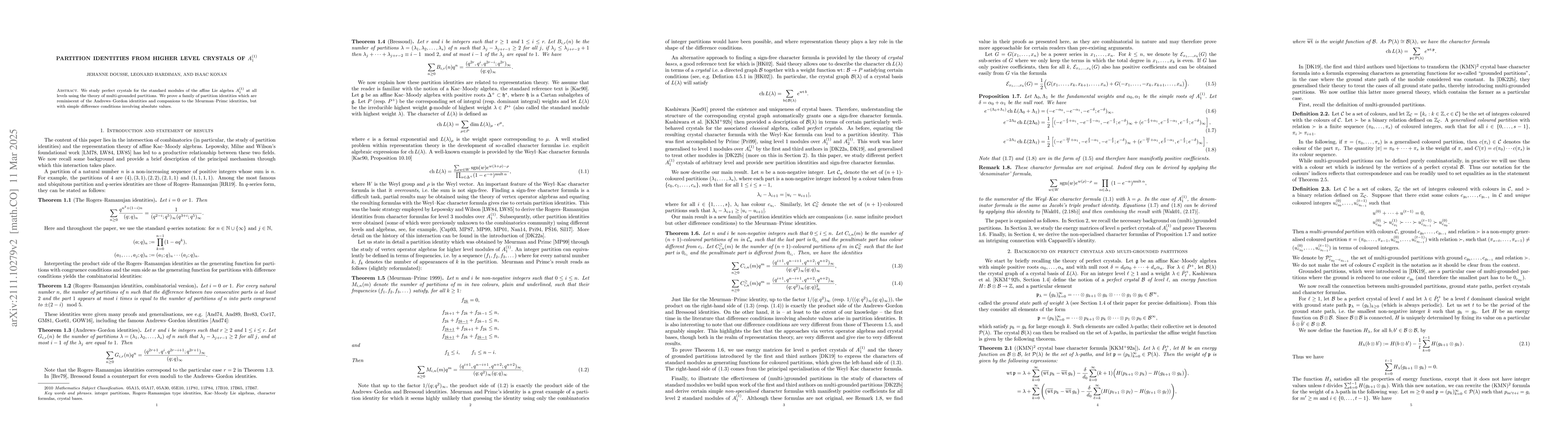 We study perfect crystals for the standard modules of the affine Lie algebra $A_1^{(1)}$ at all levels using the theory of multi-grounded partitions. We prove a family of partition identities which are reminiscent of the Andrews-Gordon identities and companions to the Meurman-Primc identities, but with simple difference conditions involving absolute values. We also give simple non-specialised character formulas with obviously positive coefficients for the three level 2 standard modules.