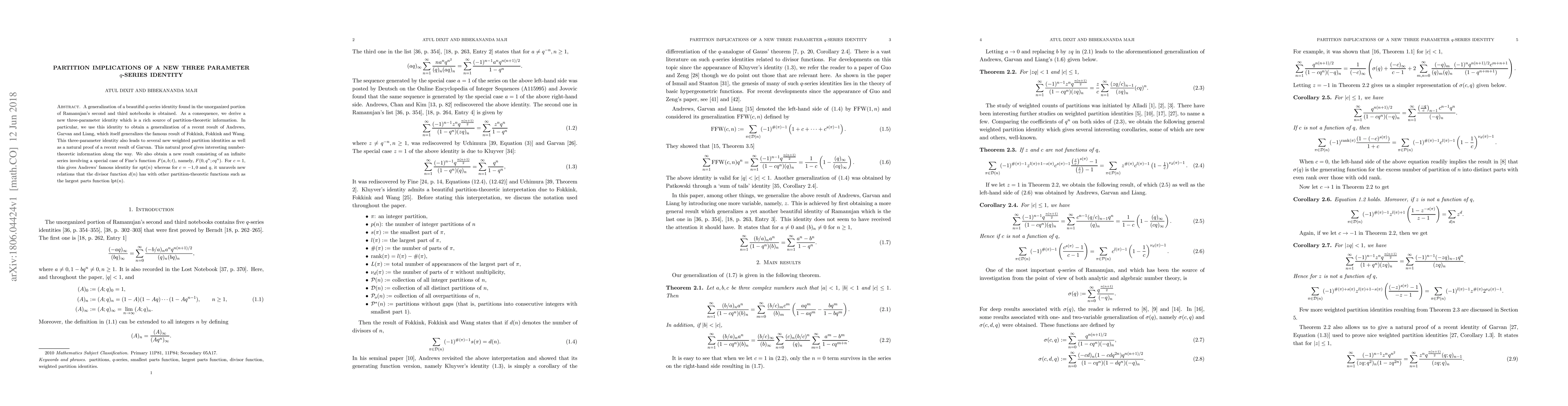 A generalization of a beautiful $q$-series identity found in the unorganized portion of Ramanujan's second and third notebooks is obtained. As a consequence, we derive a new three-parameter identity which is a rich source of partition-theoretic information. In particular, we use this identity to obtain a generalization of a recent result of Andrews, Garvan and Liang, which itself generalizes the famous result of Fokkink, Fokkink and Wang. This three-parameter identity also leads to several new weighted partition identities as well as a natural proof of a recent result of Garvan. This natural proof gives interesting number-theoretic information along the way. We also obtain a new result consisting of an infinite series involving a special case of Fine's function $F(a,b;t)$, namely, $F(0,q^n;cq^n)$. For $c=1$, this gives Andrews' famous identity for $\mathrm{spt}(n)$ whereas for $c=-1, 0$ and $q$, it unravels new relations that the divisor function $d(n)$ has with other partition-theoretic functions such as the largest parts function $\mathrm{lpt}(n)$.
