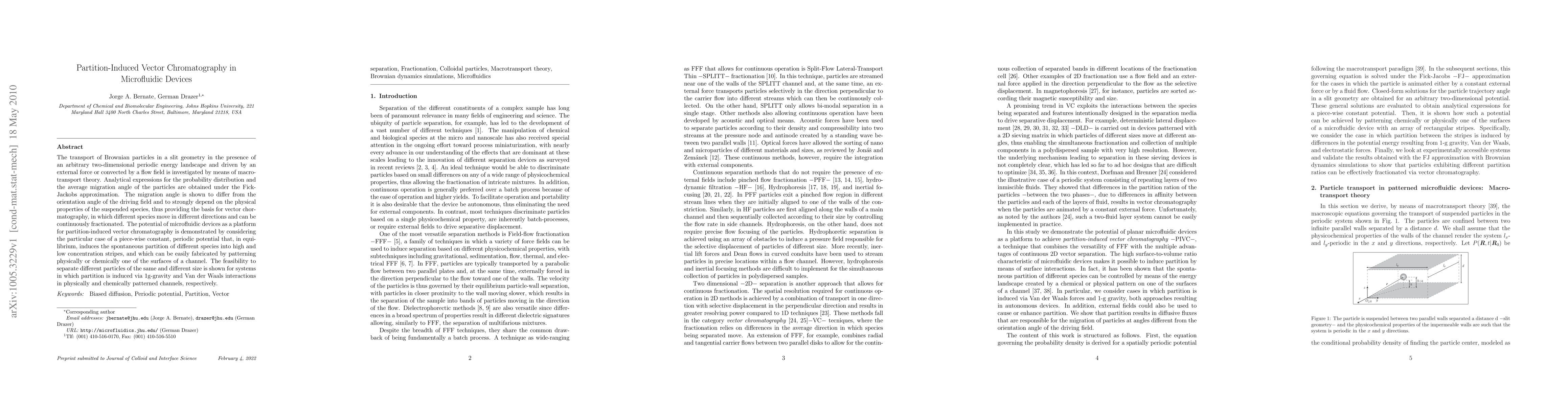 The transport of Brownian particles in a slit geometry in the presence of an arbitrary two-dimensional periodic energy landscape and driven by an external force or convected by a flow field is investigated by means of macrotransport theory. Analytical expressions for the probability distribution and the average migration angle of the particles are obtained under the Fick-Jackobs approximation. The migration angle is shown to differ from the orientation angle of the driving field and to strongly depend on the physical properties of the suspended species, thus providing the basis for vector chormatography, in which different species move in different directions and can be continuously fractionated. The potential of microfluidic devices as a platform for partition-induced vector chromatography is demonstrated by considering the particular case of a piece-wise constant, periodic potential that, in equilibrium, induces the spontaneous partition of different species into high and low concentration stripes, and which can be easily fabricated by patterning physically or chemically one of the surfaces of a channel. The feasibility to separate different particles of the same and different size is shown for systems in which partition is induced via 1g-gravity and Van der Waals interactions in physically and chemically patterned channels, respectively.