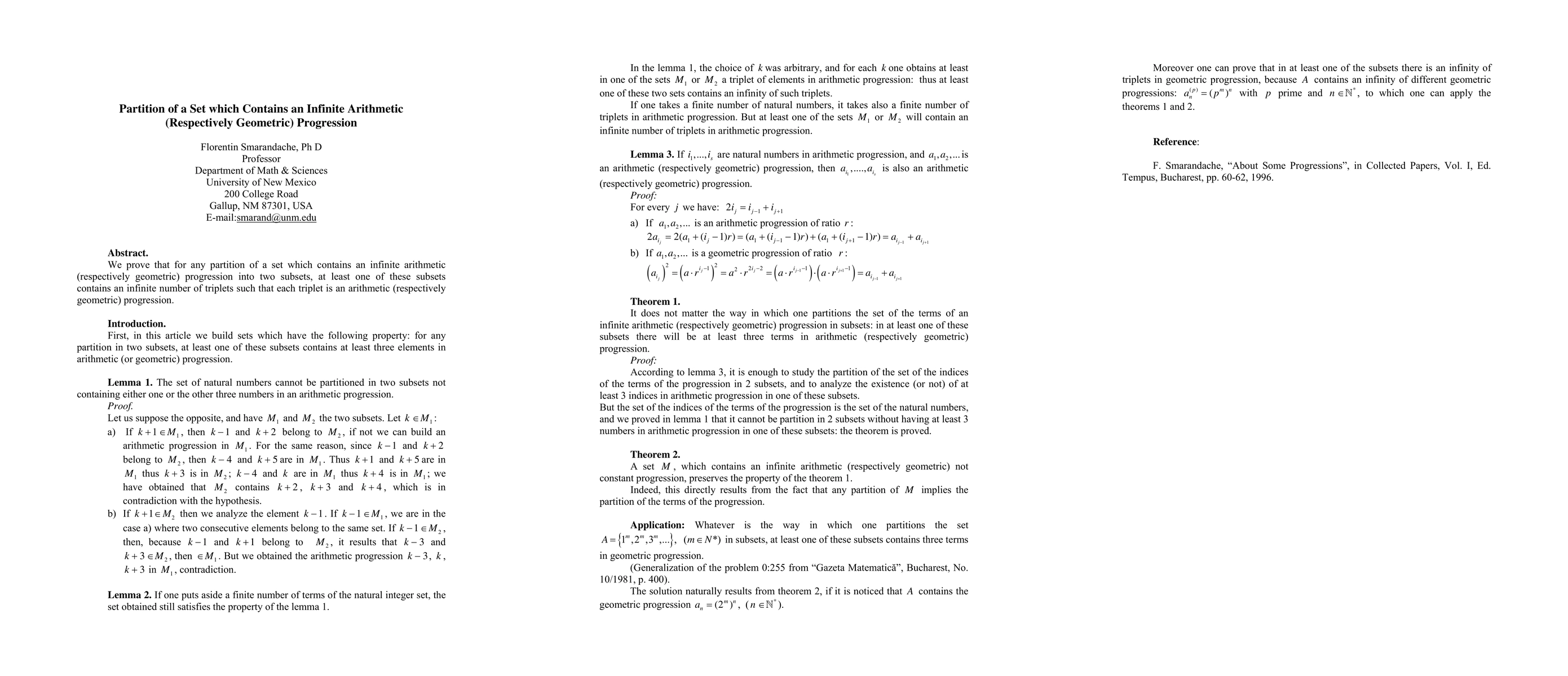 Summary: This paper proves that any partition of a set containing an infinite arithmetic or geometric progression into two disjoint subsets will necessarily have at least one subset containing an infinite number of triplets that maintain the original progression type.