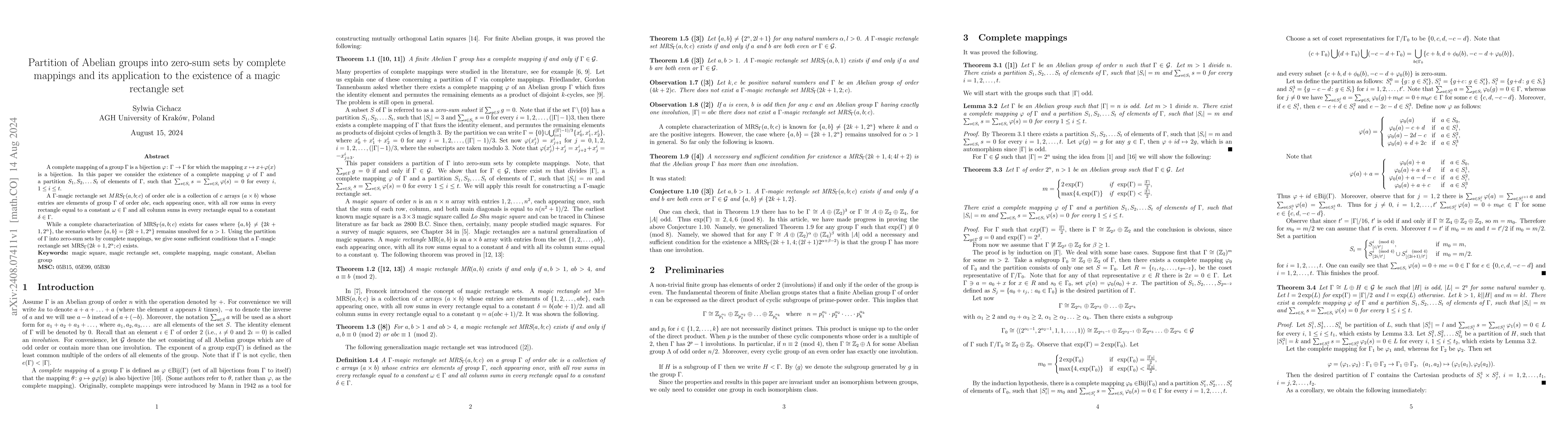 This paper explores complete mappings of Abelian groups that partition the group into zero-sum sets and applies this concept to determine sufficient conditions for the existence of a magic rectangle set when $\{a,b\}=\{2k+1,2^{\alpha}\}$, extending previous characterizations for other cases.