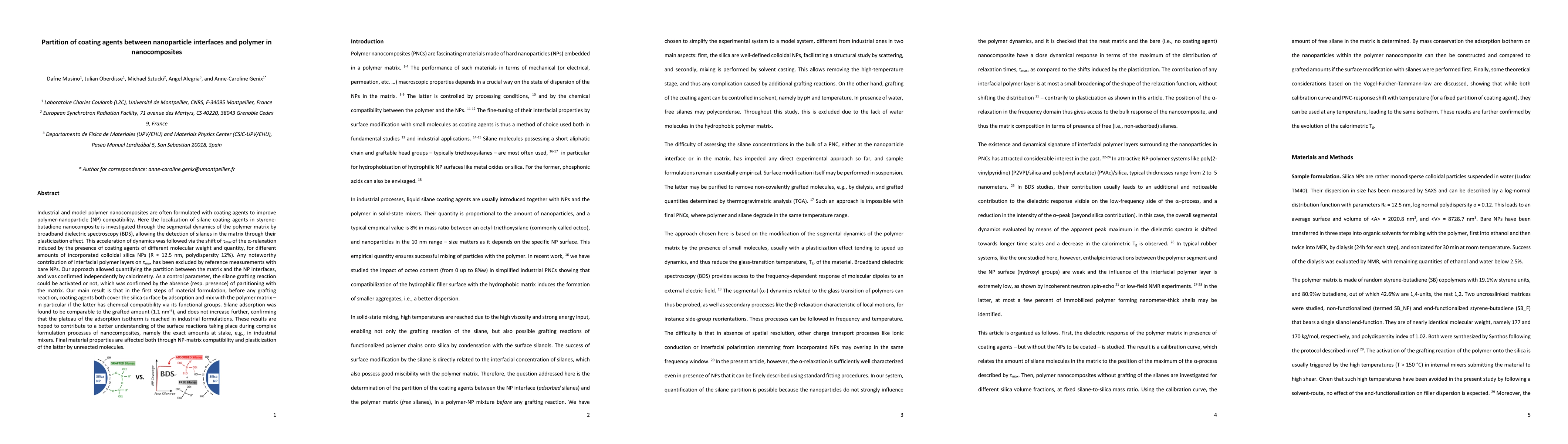 This study investigates how silane coating agents partition between silica nanoparticle interfaces and the styrene-butadiene polymer matrix in nanocomposites using broadband dielectric spectroscopy and calorimetry. The results reveal that before grafting reactions, silanes both adsorb onto the silica surface and mix with the polymer matrix, significantly impacting material properties via improved compatibility and polymer plasticization.