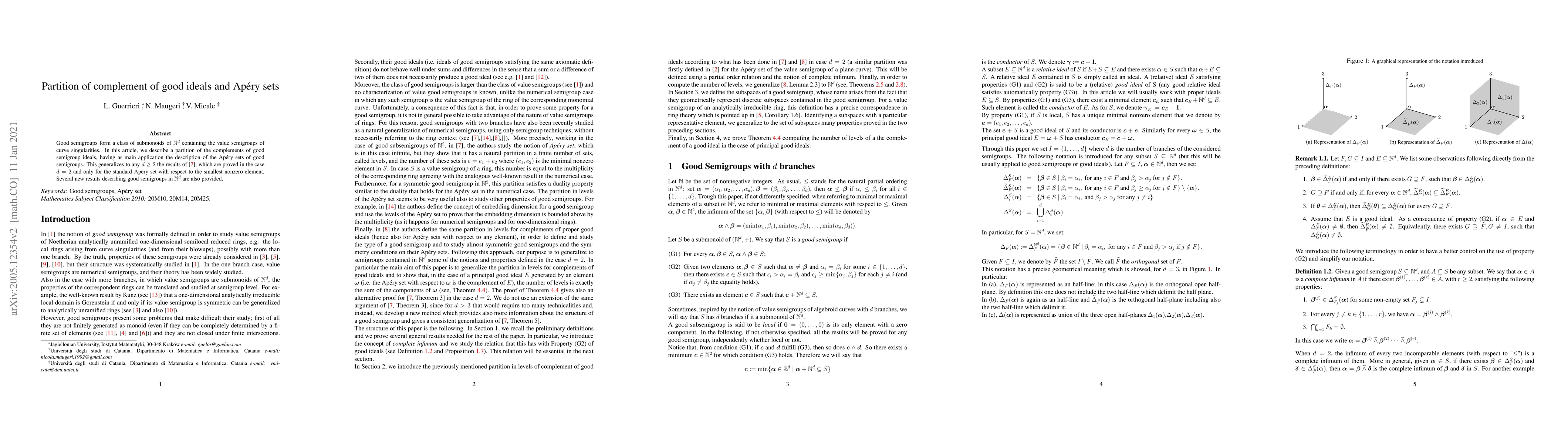 Good semigroups form a class of submonoids of $\mathbb{N}^d$ containing the value semigroups of curve singularities. In this article, we describe a partition of the complements of good semigroup ideals, having as main application the description of the Ap\'{e}ry sets of good semigroups. This generalizes to any $d \geq 2$ the results of a recent paper of D'Anna, Guerrieri and Micale, which are proved in the case $d=2$ and only for the standard Ap\'{e}ry set with respect to the smallest nonzero element. Several new results describing good semigroups in $\mathbb{N}^d$ are also provided.