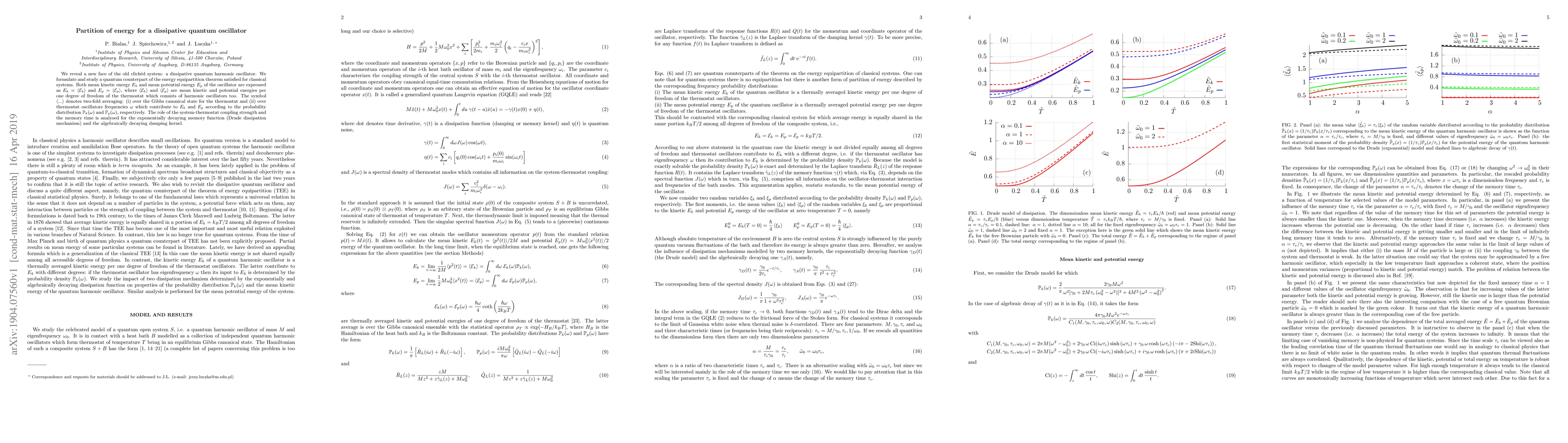 We reveal a new face of the old clich\'ed system: a dissipative quantum harmonic oscillator. We formulate and study a quantum counterpart of the energy equipartition theorem satisfied for classical systems.Both mean kinetic energy $E_k$ and mean potential energy $E_p$ of the oscillator are expressed as $E_k = \langle \mathcal E_k \rangle$ and $E_p = \langle \mathcal E_p \rangle$, where $\langle \mathcal E_k \rangle$ and $ \langle \mathcal E_p \rangle$ are mean kinetic and potential energies per one degree of freedom of the thermostat which consists of harmonic oscillators too. The symbol $\langle ...\rangle$ denotes two-fold averaging: (i) over the Gibbs canonical state for the thermostat and (ii) over thermostat oscillators frequencies $\omega$ which contribute to $E_k$ and $E_p$ according to the probability distribution $\mathbb{P}_k(\omega)$ and $\mathbb{P}_p(\omega)$, respectively. The role of the system-thermostat coupling strength and the memory time is analysed for the exponentially decaying memory function (Drude dissipation mechanism) and the algebraically decaying damping kernel.