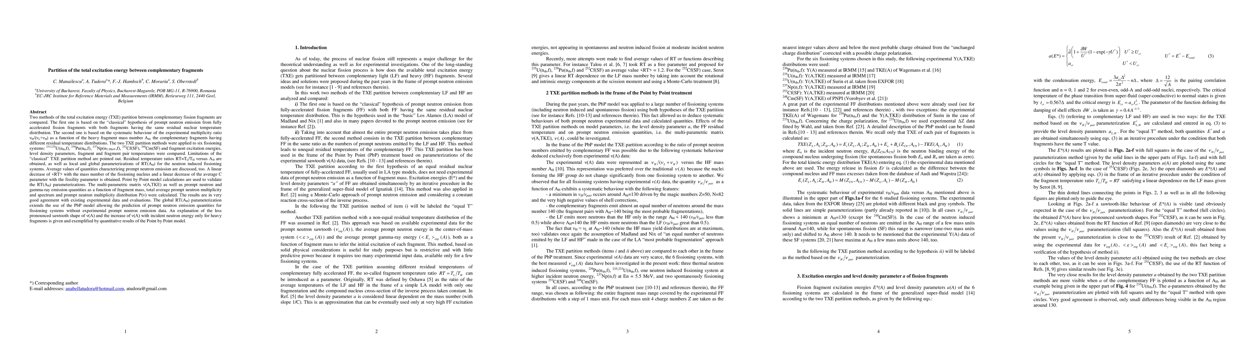 This paper compares two methods for partitioning total excitation energy between complementary fission fragments, evaluating their effectiveness on six fissioning systems. It highlights limitations of the classical method and proposes a new approach based on experimental multiplicity ratios, providing parameterizations for residual temperature ratios and validating them using the Point by Point model.