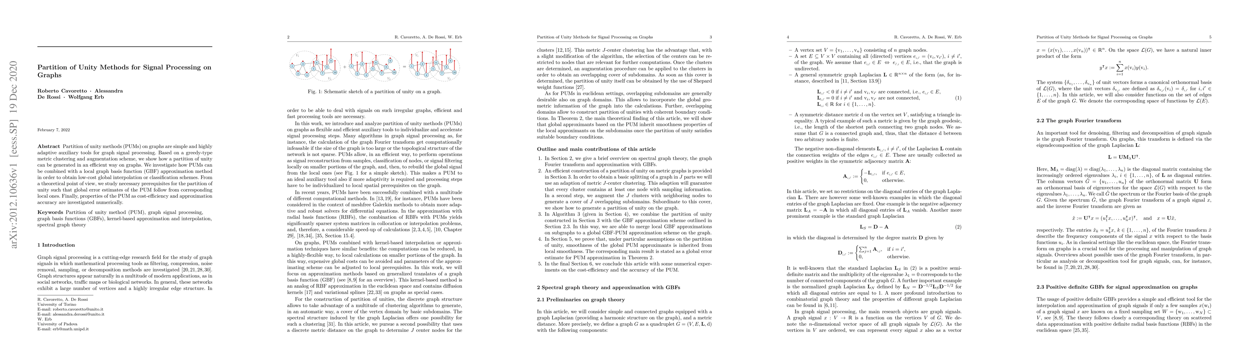 This paper explores partition of unity methods (PUMs) for efficient graph signal processing, demonstrating their generation through a clustering and augmentation scheme. The study combines PUMs with local graph basis function approximations for low-cost global interpolation or classification, and investigates their theoretical prerequisites and numerical properties for cost-efficiency and accuracy.
