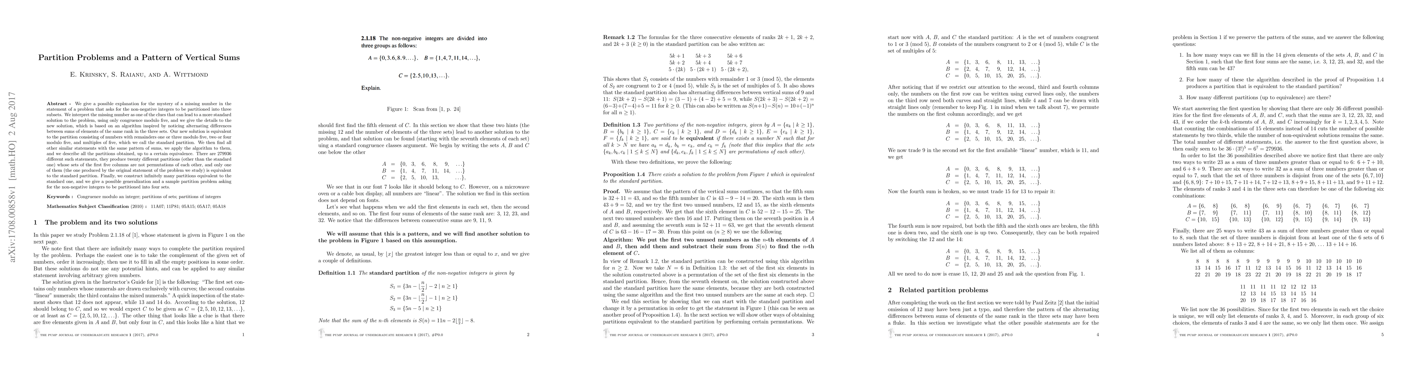We give a possible explanation for the mystery of a missing number in the statement of a problem that asks for the non-negative integers to be partitioned into three subsets. We interpret the missing number as one of the clues that can lead to a more standard solution to the problem, using only congruence modulo five, and we give the details to the new solution, which is based on an algorithm inspired by noticing alternating differences between sums of elements of the same rank in the three sets. Our new solution is equivalent to the partition consisting of numbers with remainders one or three modulo five, two or four modulo five, and multiples of five, which we call the standard partition. We then find all other similar statements with the same pattern of sums, we apply the algorithm to them, and we describe all the partitions obtained, up to a certain equivalence. There are $279936$ different such statements, they produce twenty different partitions (other than the standard one) whose sets of the first five columns are not permutations of each other, and only one of them (the one produced by the original statement of the problem we study) is equivalent to the standard partition. Finally, we construct infinitely many partitions equivalent to the standard one, and we give a possible generalization and a sample partition problem asking for the non-negative integers to be partitioned into four sets.
