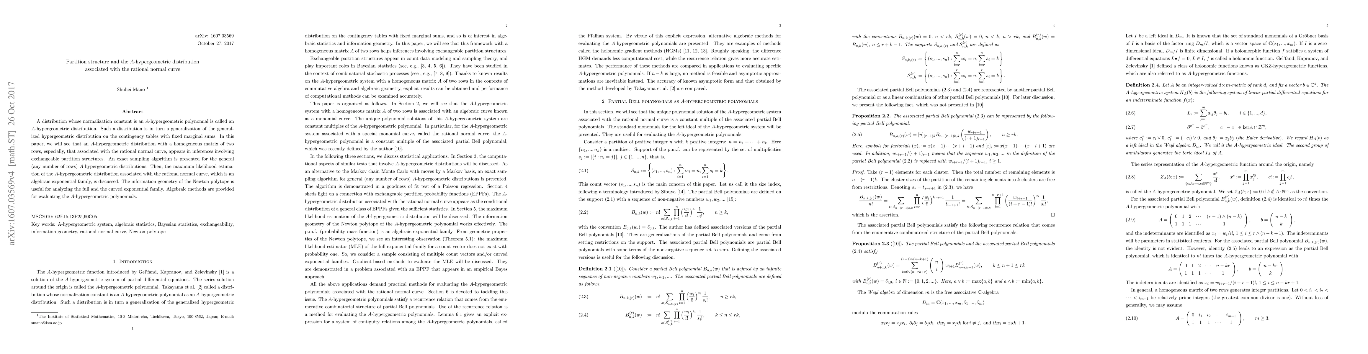 A distribution whose normalization constant is an A-hypergeometric polynomial is called an A-hypergeometric distribution. Such a distribution is in turn a generalization of the generalized hypergeometric distribution on the contingency tables with fixed marginal sums. In this paper, we will see that an A-hypergeometric distribution with a homogeneous matrix of two rows, especially, that associated with the rational normal curve, appears in inferences involving exchangeable partition structures. An exact sampling algorithm is presented for the general (any number of rows) A-hypergeometric distributions. Then, the maximum likelihood estimation of the A-hypergeometric distribution associated with the rational normal curve, which is an algebraic exponential family, is discussed. The information geometry of the Newton polytope is useful for analyzing the full and the curved exponential family. Algebraic methods are provided for evaluating the A-hypergeometric polynomials.