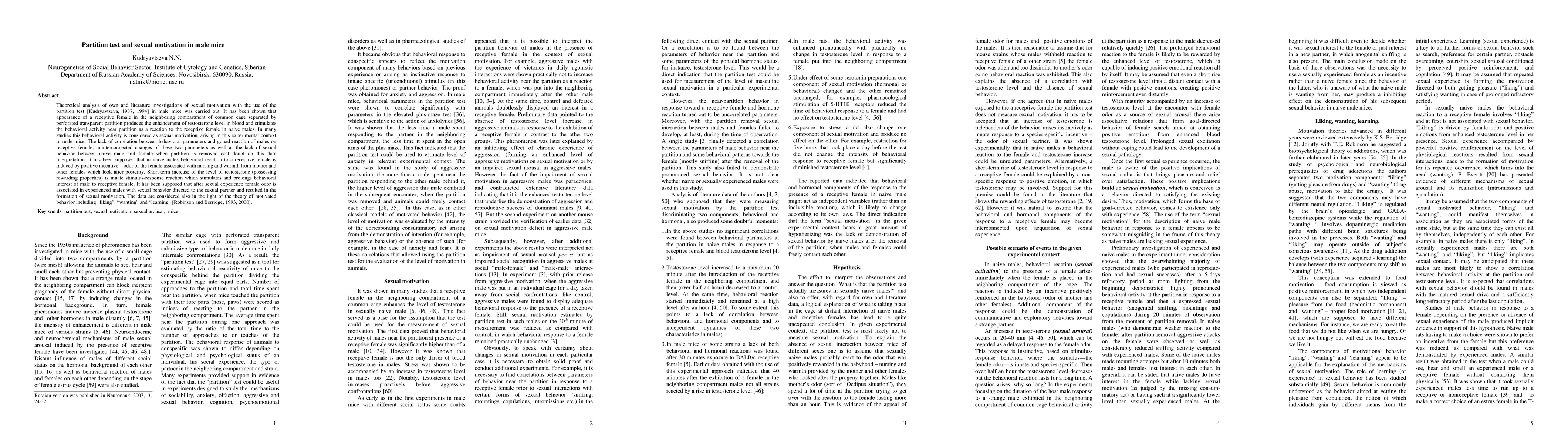 Theoretical analysis of own and literature investigations of sexual motivation with the use of the partition test [Kudryavtseva, 1987, 1994] in male mice was carried out. It has been shown that appearance of a receptive female in the neighboring compartment of common cage separated by perforated transparent partition produces the enhancement of testosterone level in blood and stimulates the behavioral activity near partition as a reaction to the receptive female in naive males. In many studies this behavioral activity is considered as sexual motivation, arising in this experimental context in male mice. The lack of correlation between behavioral parameters and gonad reaction of males on receptive female, uninterconnected changes of these two parameters as well as the lack of sexual behavior between naive male and female when partition is removed cast doubt on this data interpretation. It has been supposed that in naive males behavioral reaction to a receptive female is induced by positive incentive - odor of the female associated with nursing and warmth from mother and other females which look after posterity. Short-term increase of the level of testosterone (possessing rewarding properties) is innate stimulus-response reaction which stimulates and prolongs behavioral interest of male to receptive female. It has been supposed that after sexual experience female odor is associated in experienced males with sexual behavior directed to the sexual partner and resulted in the formation of sexual motivation. The data are considered also in the light of the theory of motivated behavior including "liking", "wanting" and "learning" [Robinson and Berridge, 1993, 2000].