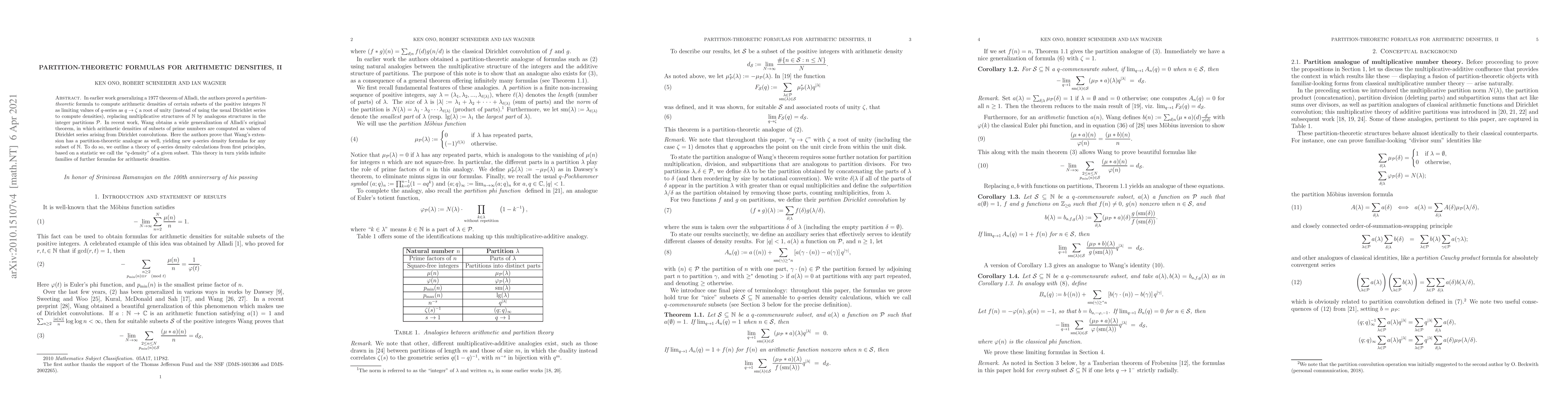 In earlier work generalizing a 1977 theorem of Alladi, the authors proved a partition-theoretic formula to compute arithmetic densities of certain subsets of the positive integers $\mathbb N$ as limiting values of $q$-series as $q\to \zeta$ a root of unity (instead of using the usual Dirichlet series to compute densities), replacing multiplicative structures of $\mathbb N$ by analogous structures in the integer partitions $\mathcal P$. In recent work, Wang obtains a wide generalization of Alladi's original theorem, in which arithmetic densities of subsets of prime numbers are computed as values of Dirichlet series arising from Dirichlet convolutions. Here the authors prove that Wang's extension has a partition-theoretic analogue as well, yielding new $q$-series density formulas for any subset of $\mathbb N$. To do so, we outline a theory of $q$-series density calculations from first principles, based on a statistic we call the "$q$-density" of a given subset. This theory in turn yields infinite families of further formulas for arithmetic densities.
