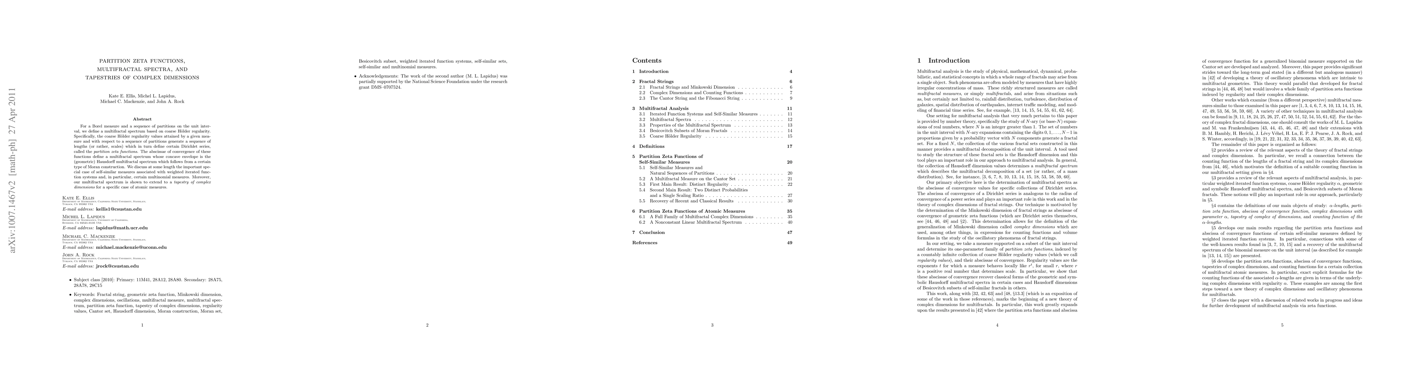 This paper introduces partition zeta functions derived from Borel measures and their multifractal spectra based on coarse Hölder regularity. It demonstrates the Hausdorff multifractal spectrum from a Moran construction and extends the analysis to complex dimensions for specific atomic measures, particularly focusing on self-similar measures from weighted iterated function systems.
