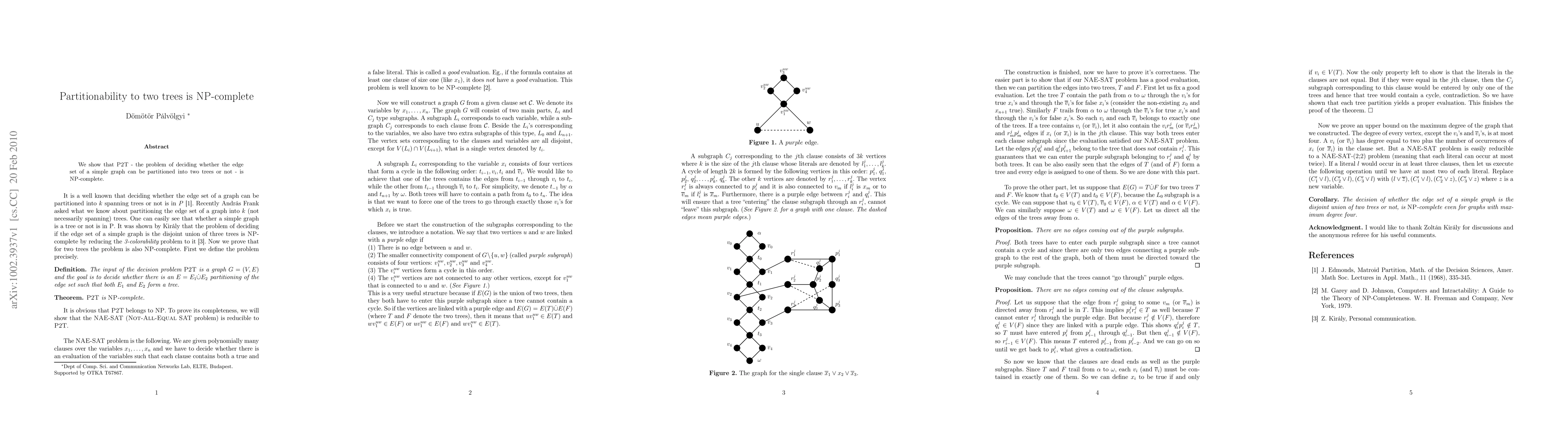 Summary: This paper demonstrates that the P2T problem, which involves determining whether the edges of a simple graph can be partitioned into two trees, is NP-complete, establishing its computational complexity.