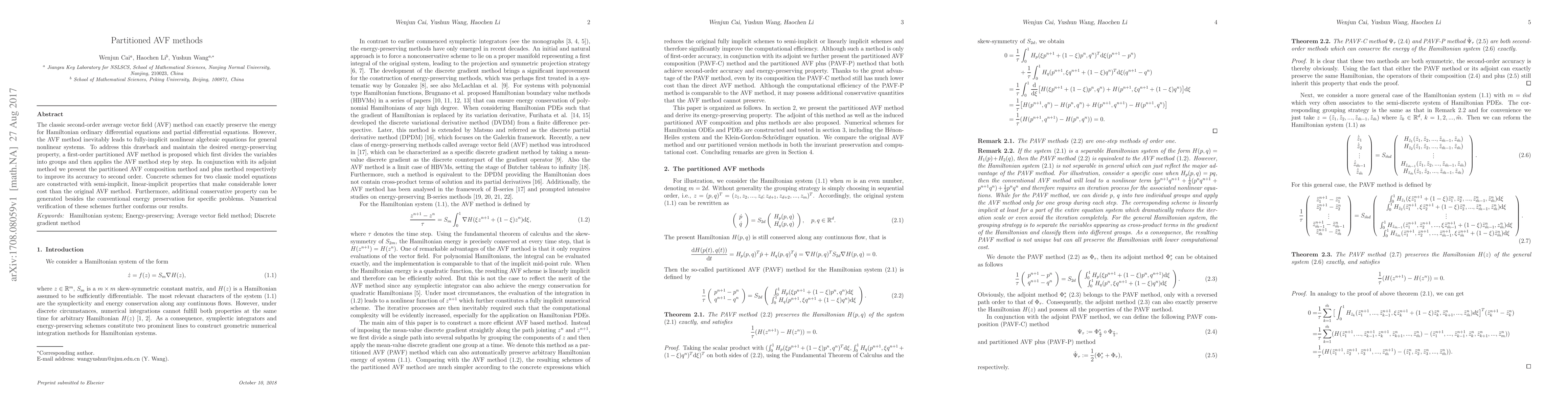 The classic second-order average vector field (AVF) method can exactly preserve the energy for Hamiltonian ordinary differential equations and partial differential equations. However, the AVF method inevitably leads to fully-implicit nonlinear algebraic equations for general nonlinear systems. To address this drawback and maintain the desired energy-preserving property, a first-order partitioned AVF method is proposed which first divides the variables into groups and then applies the AVF method step by step. In conjunction with its adjoint method we present the partitioned AVF composition method and plus method respectively to improve its accuracy to second order. Concrete schemes for two classic model equations are constructed with semi-implicit, linear-implicit properties that make considerable lower cost than the original AVF method. Furthermore, additional conservative property can be generated besides the conventional energy preservation for specific problems. Numerical verification of these schemes further conforms our results.
