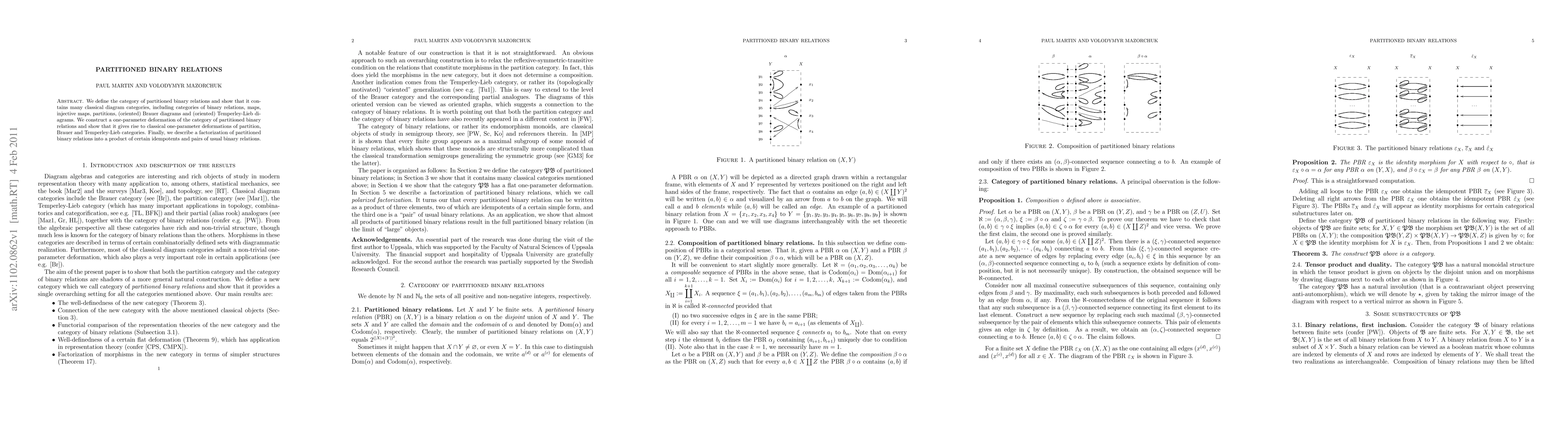 The paper introduces a category of partitioned binary relations encompassing various classical diagram categories and constructs a one-parameter deformation of this category leading to classical deformations of partition, Brauer, and Temperley-Lieb categories. It also explores a factorization of these relations into idempotents and pairs of usual binary relations.