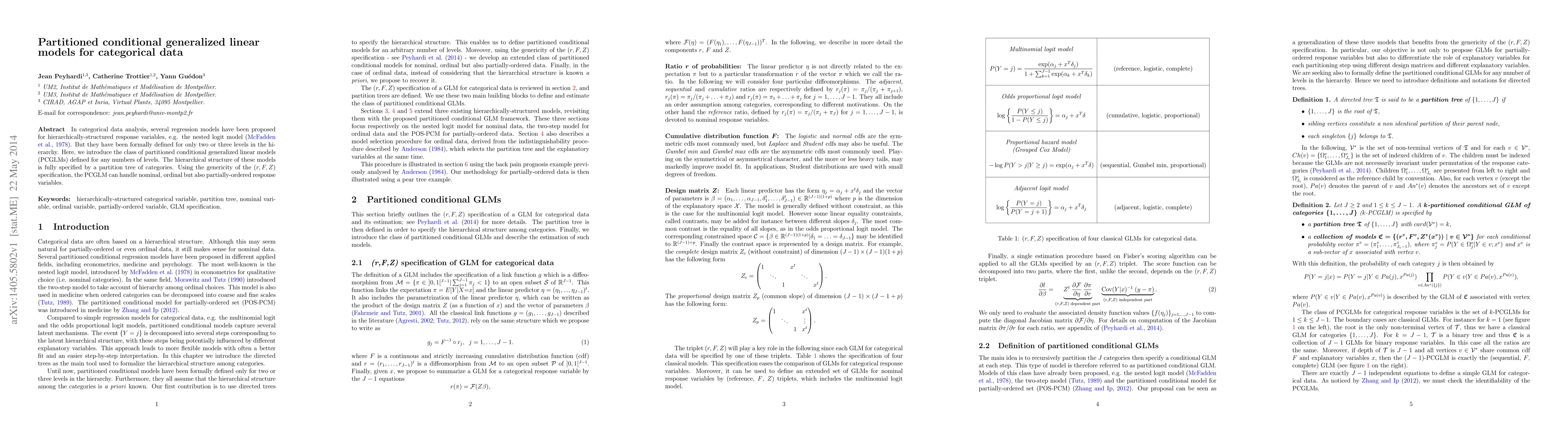 This paper introduces partitioned conditional generalized linear models (PCGLMs) for categorical data analysis, capable of handling hierarchically-structured response variables with any number of levels. The models are specified by a partition tree and can manage nominal, ordinal, and partially-ordered response variables through the (r,F,Z) specification.