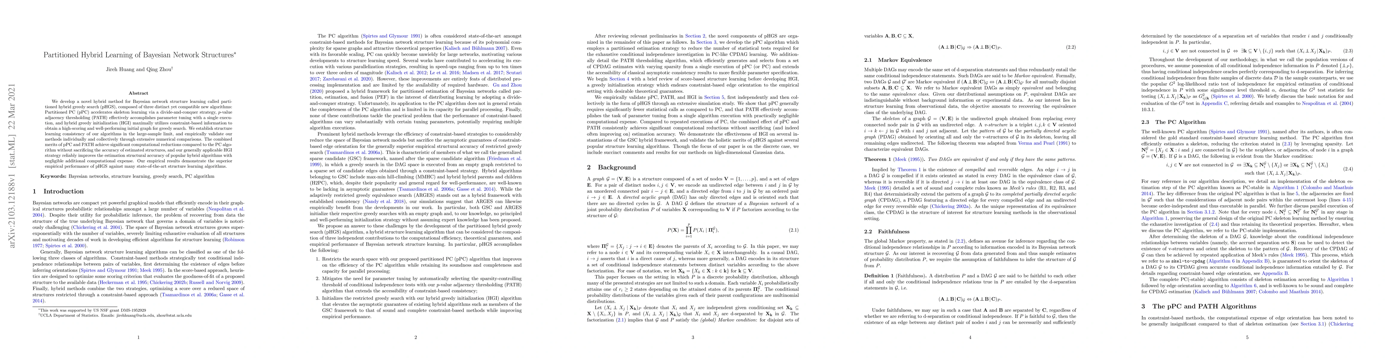 The paper introduces a partitioned hybrid greedy search (pHGS) method for learning Bayesian network structures, combining three algorithms: Partitioned PC (pPC), p-value adjacency thresholding (PATH), and hybrid greedy initialization (HGI) to enhance computational efficiency and accuracy. Empirical results show pHGS outperforms other state-of-the-art algorithms.