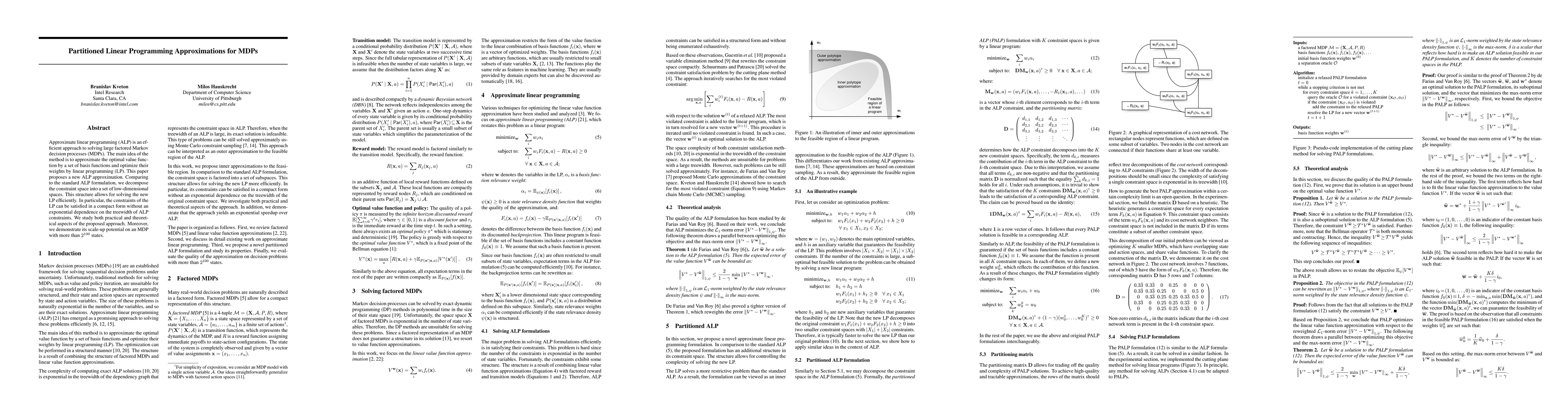 This paper proposes a partitioned linear programming approximation for solving large factored Markov decision processes (MDPs) by decomposing the constraint space into low-dimensional subspaces, enabling efficient computation without exponential complexity. The method demonstrates practical scalability, as shown through its application to an MDP with over 2^100 states.