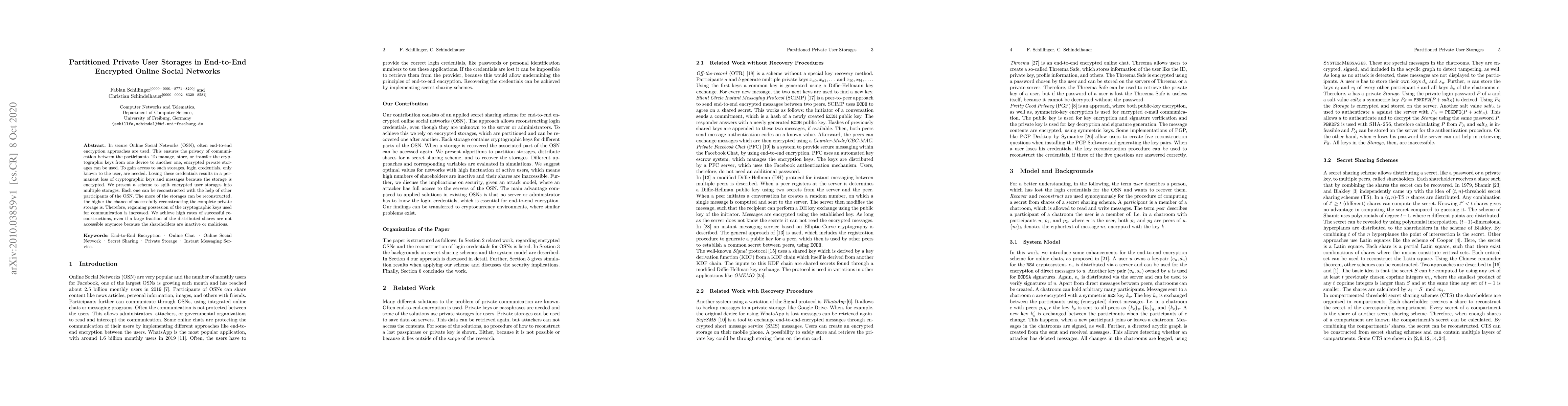 This paper proposes a scheme to partition encrypted private user storages in end-to-end encrypted online social networks into multiple shares, enhancing recovery chances even if some shares are lost or inaccessible due to inactive or malicious participants. The method increases the likelihood of reconstructing complete private storages and regaining access to cryptographic keys.