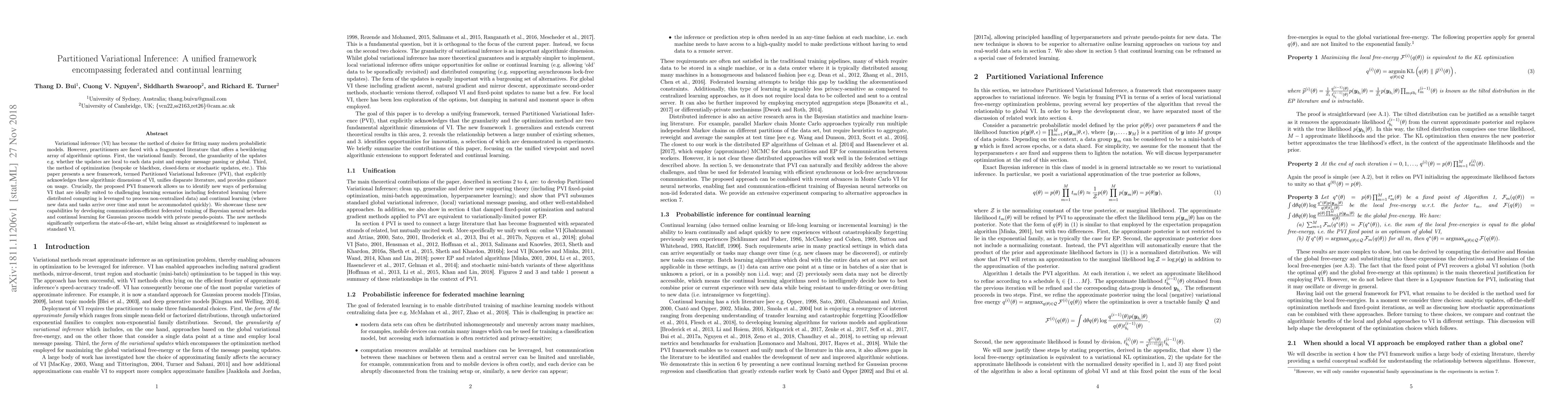 This paper introduces Partitioned Variational Inference (PVI), a unified framework for variational inference that addresses fragmented algorithmic options, and applies it to federated and continual learning scenarios, achieving significant performance improvements over existing methods.