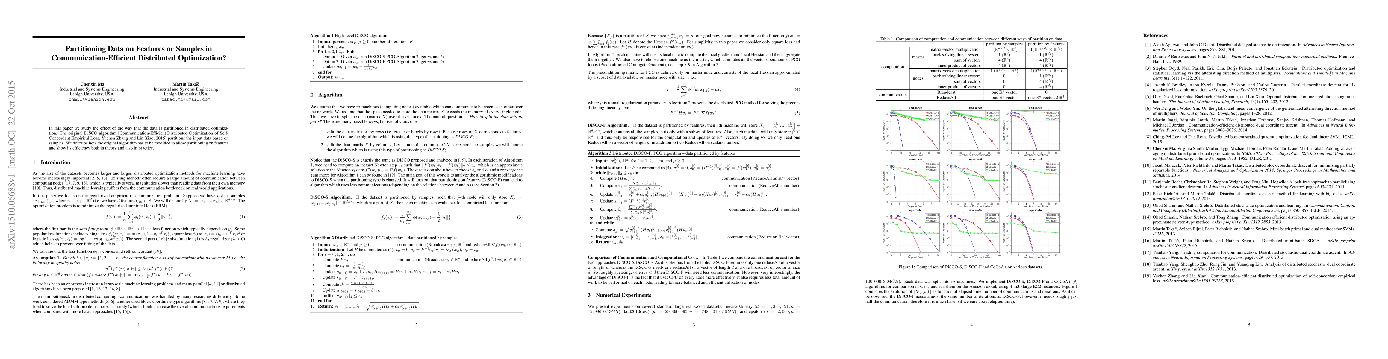 This paper investigates the impact of data partitioning strategies in distributed optimization, modifying the original DiSCO algorithm to allow feature-based partitioning and demonstrating its theoretical and practical efficiency.