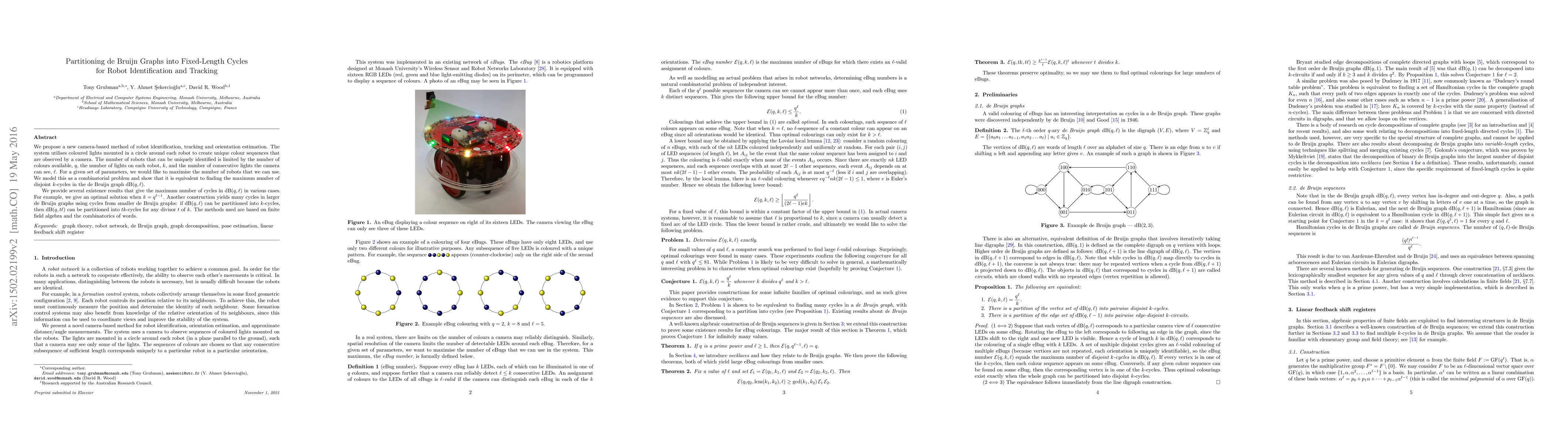 We propose a new camera-based method of robot identification, tracking and orientation estimation. The system utilises coloured lights mounted in a circle around each robot to create unique colour sequences that are observed by a camera. The number of robots that can be uniquely identified is limited by the number of colours available, $q$, the number of lights on each robot, $k$, and the number of consecutive lights the camera can see, $\ell$. For a given set of parameters, we would like to maximise the number of robots that we can use. We model this as a combinatorial problem and show that it is equivalent to finding the maximum number of disjoint $k$-cycles in the de Bruijn graph $\text{dB}(q,\ell)$. We provide several existence results that give the maximum number of cycles in $\text{dB}(q,\ell)$ in various cases. For example, we give an optimal solution when $k=q^{\ell-1}$. Another construction yields many cycles in larger de Bruijn graphs using cycles from smaller de Bruijn graphs: if $\text{dB}(q,\ell)$ can be partitioned into $k$-cycles, then $\text{dB}(q,\ell)$ can be partitioned into $tk$-cycles for any divisor $t$ of $k$. The methods used are based on finite field algebra and the combinatorics of words.