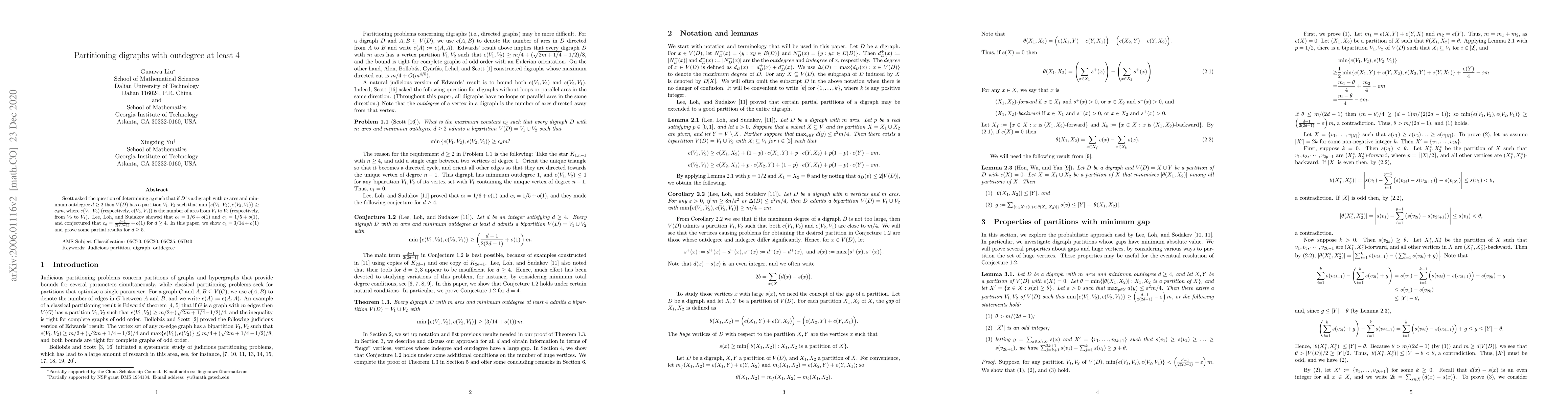 Scott asked the question of determining $c_d$ such that if $D$ is a digraph with $m$ arcs and minimum outdegree $d\ge 2$ then $V(D)$ has a partition $V_1, V_2$ such that $\min\left\{e(V_1,V_2),e(V_2, V_1)\right\}\geq c_dm$, where $e(V_1,V_2)$ (respectively, $e(V_2,V_1)$) is the number of arcs from $V_1$ to $V_2$ (respectively, from $V_2$ to $V_1$). Lee, Loh, and Sudakov showed that $c_2=1/6+o(1)$ and $c_3=1/5+o(1)$, and conjectured that $c_d= \frac{d-1}{2(2d-1)}+o(1)$ for $d\ge 4$. In this paper, we show $c_4=3/14+o(1)$ and prove some partial results for $d\ge 5$.