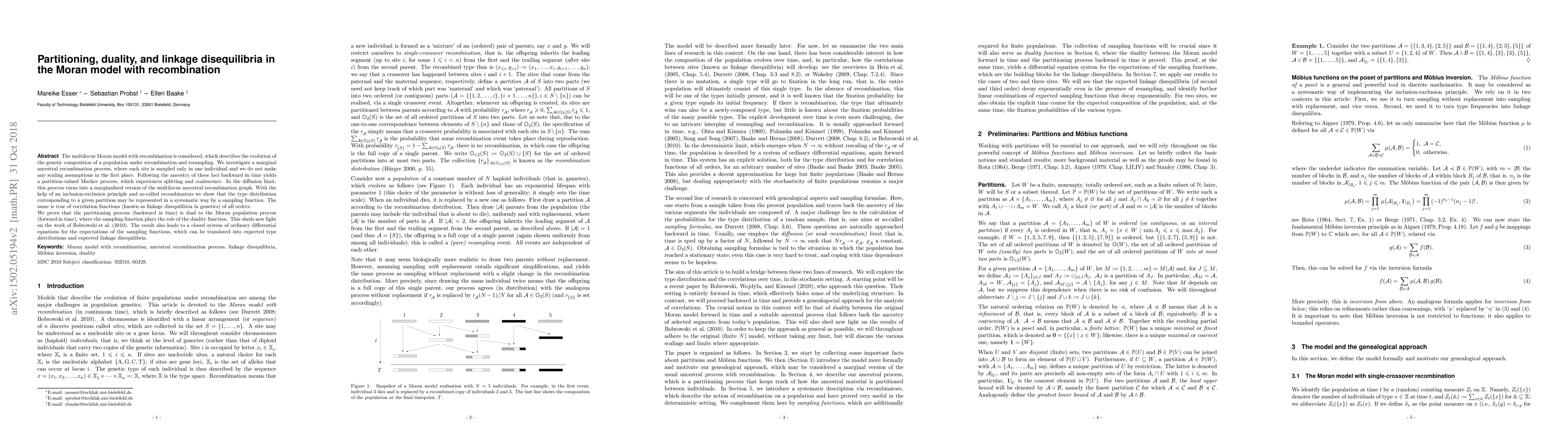 The Moran model with recombination is considered, which describes the evolution of the genetic composition of a population under recombination and resampling. There are $n$ sites (or loci), a finite number of letters (or alleles) at every site, and we do not make any scaling assumptions. In particular, we do not assume a diffusion limit. We consider the following marginal ancestral recombination process. Let $S = \{1,...,n\}$ and $\mathcal A=\{A_1, ..., A_m\}$ be a partition of $S$. We concentrate on the joint probability of the letters at the sites in $A_1$ in individual $1$, $...$, and at the sites in $A_m$ in individual $m$, where the individuals are sampled from the current population without replacement. Following the ancestry of these sites backwards in time yields a process on the set of partitions of $S$, which, in the diffusion limit, turns into a marginalised version of the $n$-locus ancestral recombination graph. With the help of an inclusion-exclusion principle, we show that the type distribution corresponding to a given partition may be represented in a systematic way, with the help of so-called recombinators and sampling functions. The same is true of correlation functions (known as linkage disequilibria in genetics) of all orders. We prove that the partitioning process (backward in time) is dual to the Moran population process (forward in time), where the sampling function plays the role of the duality function. This sheds new light on the work of Bobrowski, Wojdyla, and Kimmel (2010). The result also leads to a closed system of ordinary differential equations for the expectations of the sampling functions, which can be translated into expected type distributions and expected linkage disequilibria.