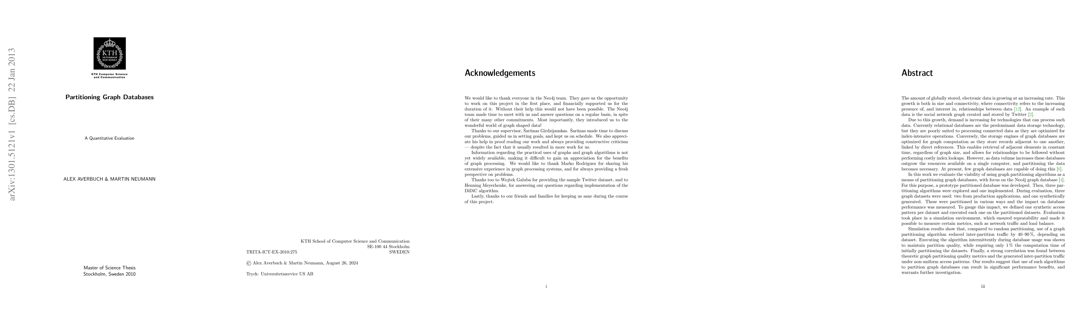 Electronic data is growing at increasing rates, in both size and connectivity: the increasing presence of, and interest in, relationships between data. An example is the Twitter social network graph. Due to this growth demand is increasing for technologies that can process such data. Currently relational databases are the predominant technology, but they are poorly suited to processing connected data as they are optimized for index-intensive operations. Conversely, graph databases are optimized for graph computation. They link records by direct references, avoiding index lookups, and enabling retrieval of adjacent elements in constant time, regardless of graph size. However, as data volume increases these databases outgrow the resources of one computer and data partitioning becomes necessary. We evaluate the viability of using graph partitioning algorithms to partition graph databases. A prototype partitioned database was developed. Three partitioning algorithms explored and one implemented. Three graph datasets were used: two real and one synthetically generated. These were partitioned in various ways and the impact on database performance measured. We defined one synthetic access pattern per dataset and executed each on the partitioned datasets. Evaluation took place in a simulation environment, ensuring repeatability and allowing measurement of metrics like network traffic and load balance. Results show that compared to random partitioning the partitioning algorithm reduced traffic by 40-90%. Executing the algorithm intermittently during usage maintained partition quality, while requiring only 1% the computation of initial partitioning. Strong correlations were found between theoretic quality metrics and generated network traffic under non-uniform access patterns.