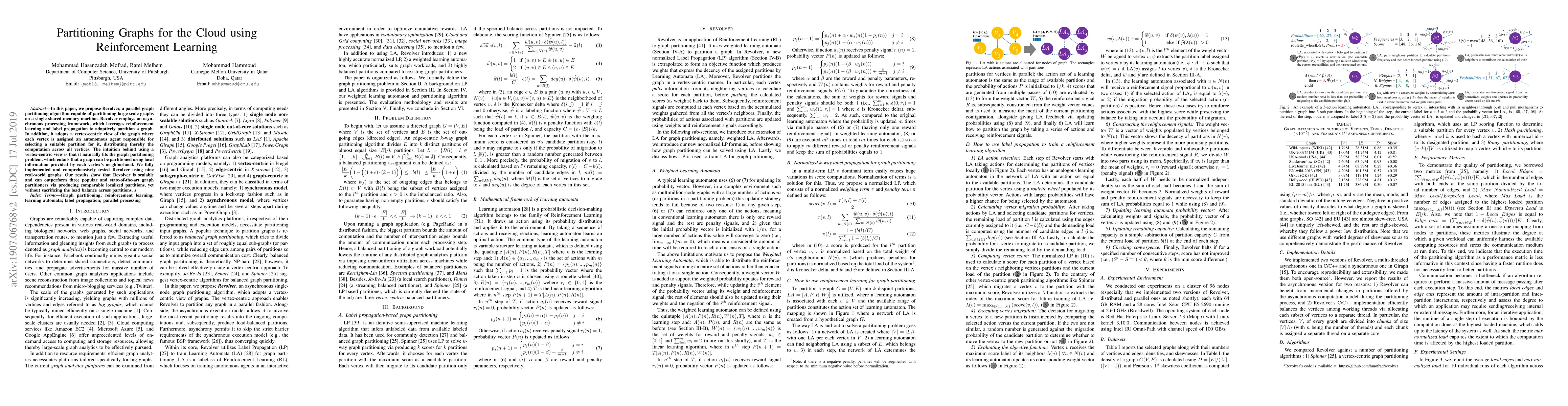 The paper introduces Revolver, a parallel graph partitioning algorithm using reinforcement learning and label propagation for adaptive partitioning on a single shared-memory machine. Tested on nine real-world graphs, Revolver outperforms popular graph partitioners by producing localized, balanced partitions through a vertex-centric approach, where each vertex assigns itself to a partition based on local neighborhood information.