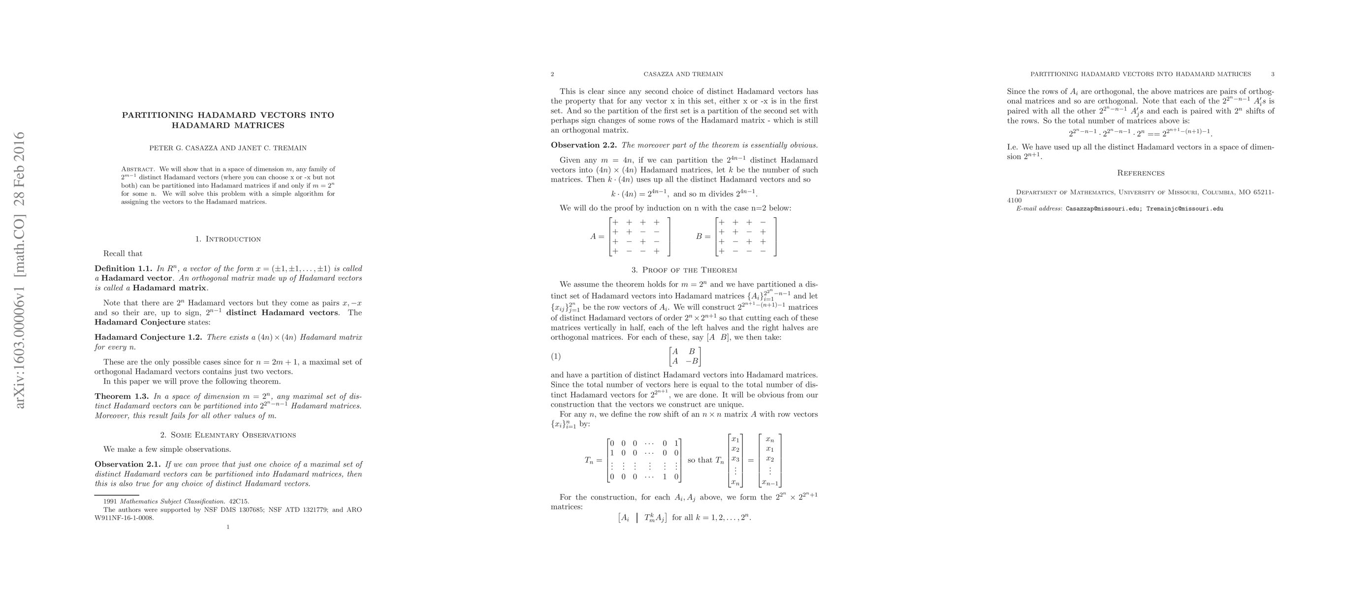 The paper provides a new theorem and proof showing the partitioning of Hadamard vectors into Hadamard matrices for dimensions that are powers of 2, along with a simple algorithm for the partitioning.