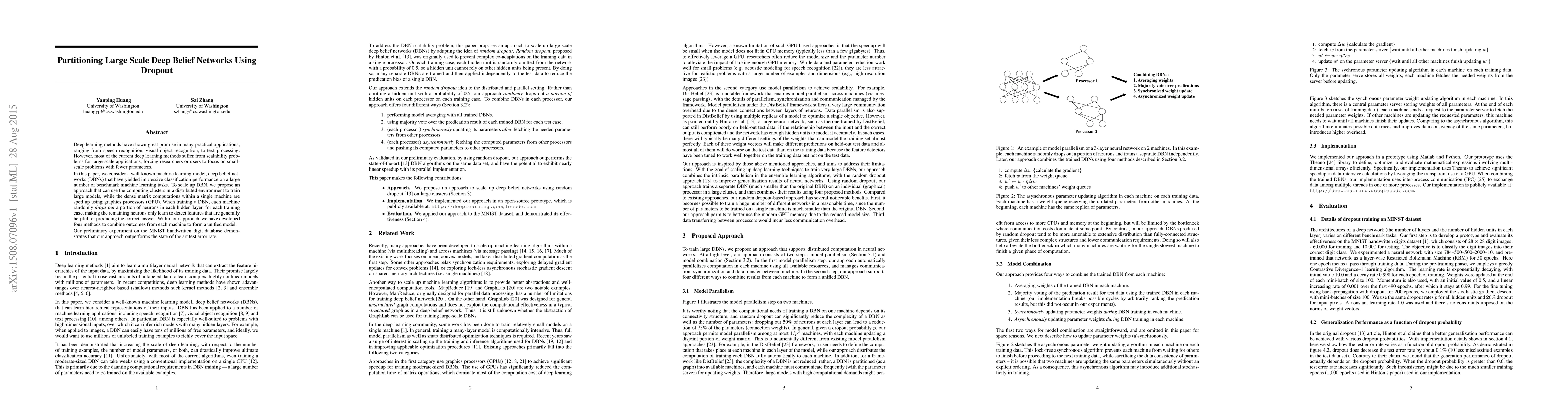 Deep learning methods have shown great promise in many practical applications, ranging from speech recognition, visual object recognition, to text processing. However, most of the current deep learning methods suffer from scalability problems for large-scale applications, forcing researchers or users to focus on small-scale problems with fewer parameters. In this paper, we consider a well-known machine learning model, deep belief networks (DBNs) that have yielded impressive classification performance on a large number of benchmark machine learning tasks. To scale up DBN, we propose an approach that can use the computing clusters in a distributed environment to train large models, while the dense matrix computations within a single machine are sped up using graphics processors (GPU). When training a DBN, each machine randomly drops out a portion of neurons in each hidden layer, for each training case, making the remaining neurons only learn to detect features that are generally helpful for producing the correct answer. Within our approach, we have developed four methods to combine outcomes from each machine to form a unified model. Our preliminary experiment on the mnst handwritten digit database demonstrates that our approach outperforms the state of the art test error rate.