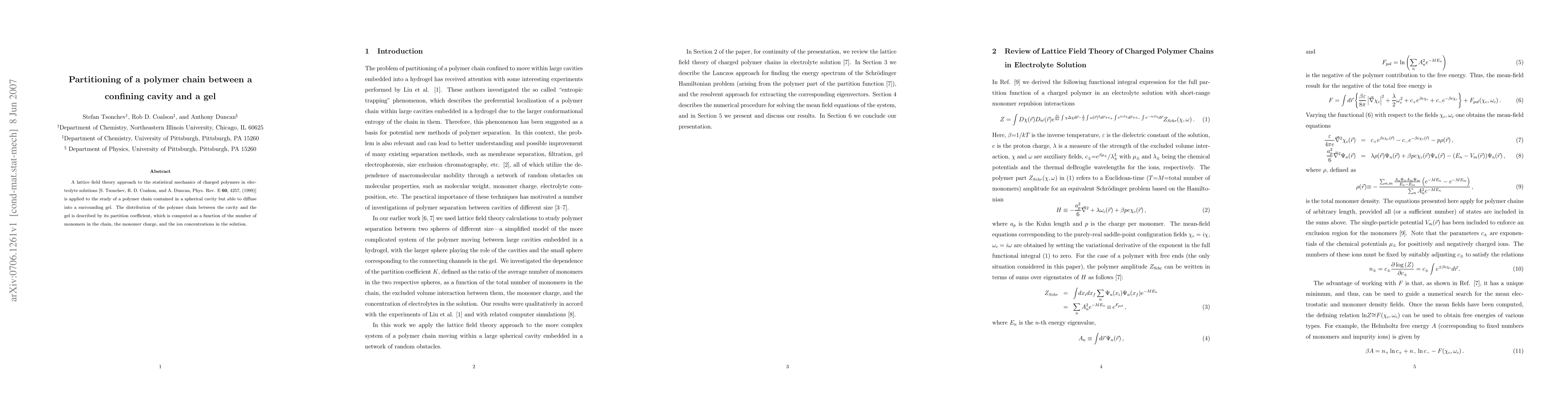 A lattice field theory approach to the statistical mechanics of charged polymers in electrolyte solutions [S. Tsonchev, R. D. Coalson, and A. Duncan, Phys. Rev. E 60, 4257, (1999)] is applied to the study of a polymer chain contained in a spherical cavity but able to diffuse into a surrounding gel. The distribution of the polymer chain between the cavity and the gel is described by its partition coefficient, which is computed as a function of the number of monomers in the chain, the monomer charge, and the ion concentrations in the solution.