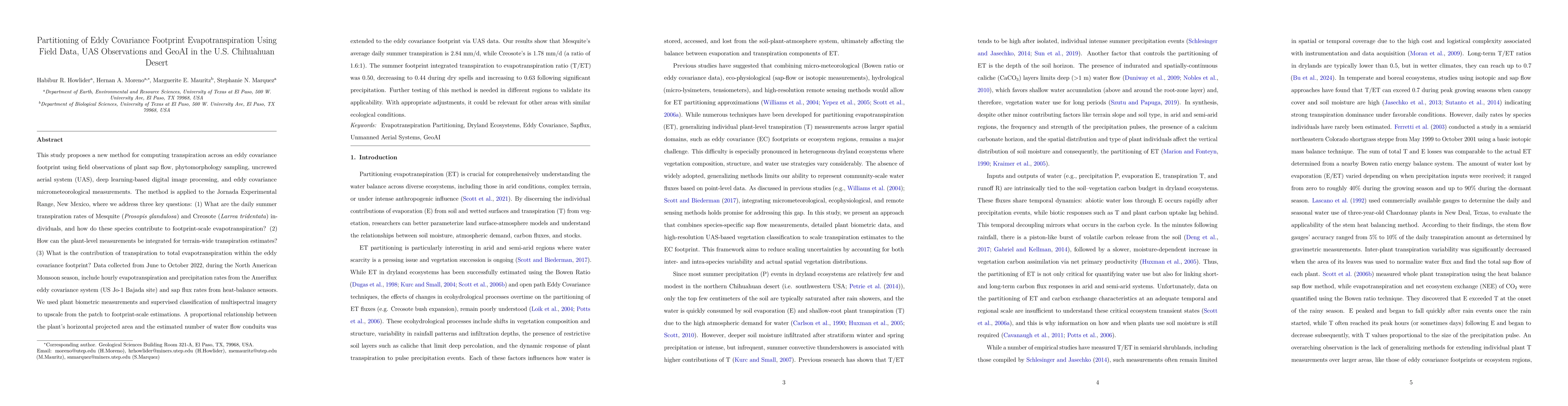 This study proposes a new method for computing transpiration across an eddy covariance footprint using field observations of plant sap flow, phytomorphology sampling, uncrewed aerial system (UAS), deep learning-based digital image processing, and eddy covariance micrometeorological measurements. The method is applied to the Jornada Experimental Range, New Mexico, where we address three key questions: (1) What are the daily summer transpiration rates of Mesquite (Prosopis glandulosa) and Creosote (Larrea tridentata) individuals, and how do these species contribute to footprint-scale evapotranspiration? (2) How can the plant-level measurements be integrated for terrain-wide transpiration estimates? (3) What is the contribution of transpiration to total evapotranspiration within the eddy covariance footprint? Data collected from June to October 2022, during the North American Monsoon season, include hourly evapotranspiration and precipitation rates from the Ameriflux eddy covariance system (US Jo-1 Bajada site) and sap flux rates from heat-balance sensors. We used plant biometric measurements and supervised classification of multispectral imagery to upscale from the patch to footprint-scale estimations. A proportional relationship between the plant's horizontal projected area and the estimated number of water flow conduits was extended to the eddy covariance footprint via UAS data. Our results show that Mesquite's average daily summer transpiration is 2.84 mm/d, while Creosote's is 1.78 mm/d (a ratio of 1.6:1). The summer footprint integrated transpiration to evapotranspiration ratio (T/ET) was 0.50, decreasing to 0.44 during dry spells and increasing to 0.63 following significant precipitation. Further testing of this method is needed in different regions to validate its applicability. With appropriate adjustments, it could be relevant for other areas with similar ecological conditions.