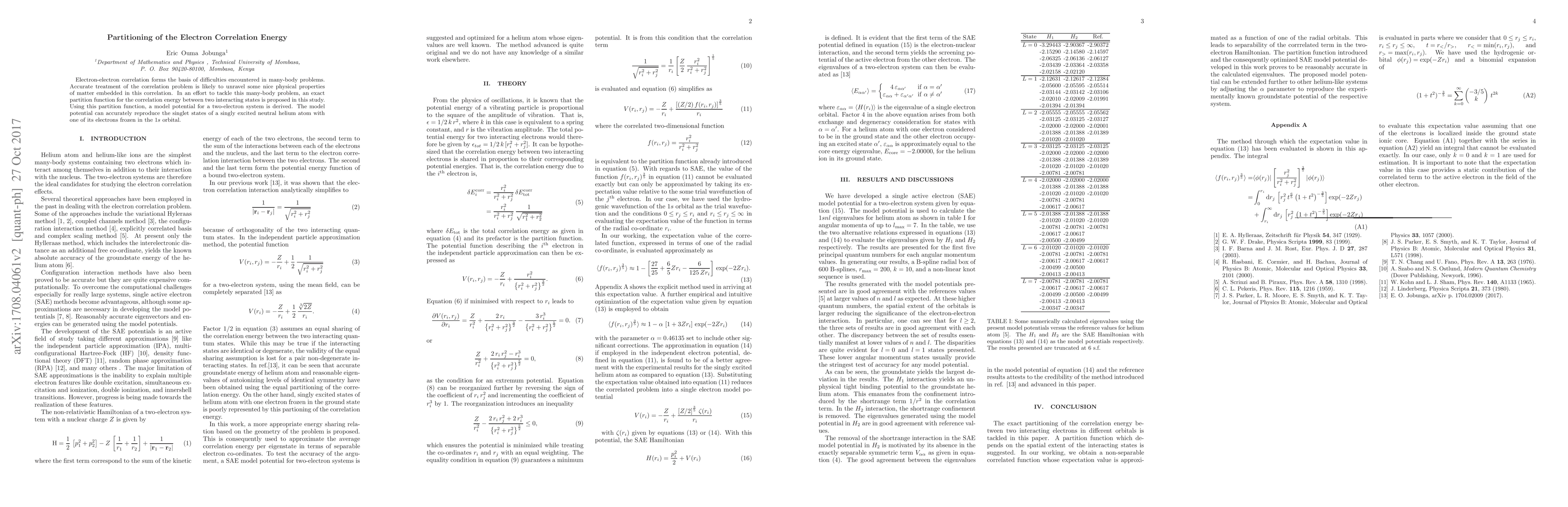 Researchers propose an exact partition function for electron correlation energy between two interacting states, leading to a model potential that accurately reproduces the singlet states of a neutral helium atom with one electron frozen in the $1s$ orbital.