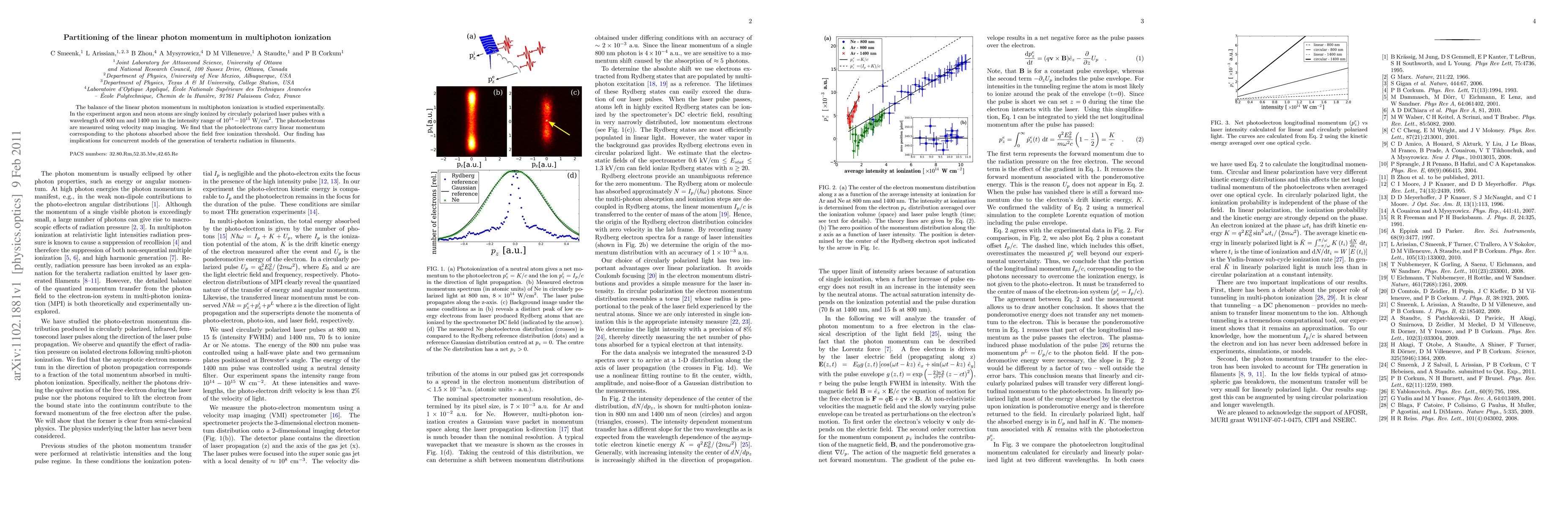 This study experimentally investigates the partitioning of linear photon momentum in multiphoton ionization of argon and neon atoms using circularly polarized laser pulses. The results show that photoelectrons carry momentum corresponding to absorbed photons, with implications for models of terahertz radiation generation in laser filaments.
