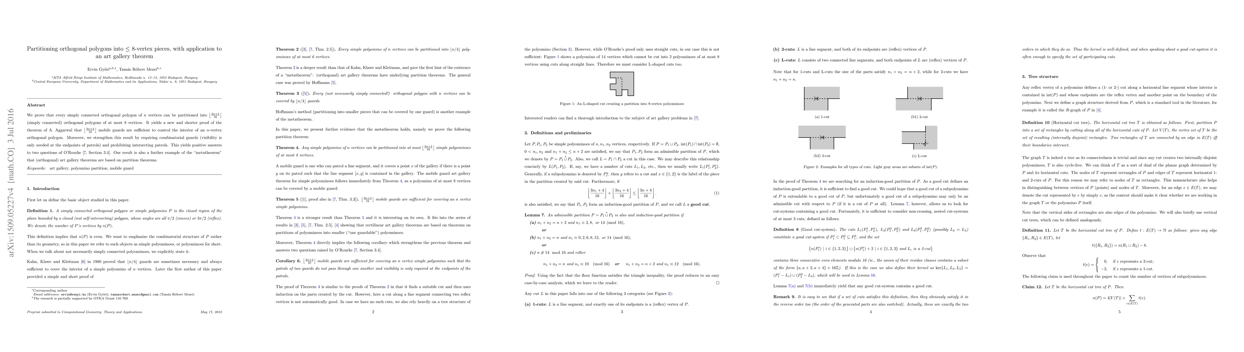 Researchers prove that an n-vertex orthogonal polygon can be partitioned into at most 8-vertex pieces, solving the art gallery theorem with improved efficiency and stronger conditions.