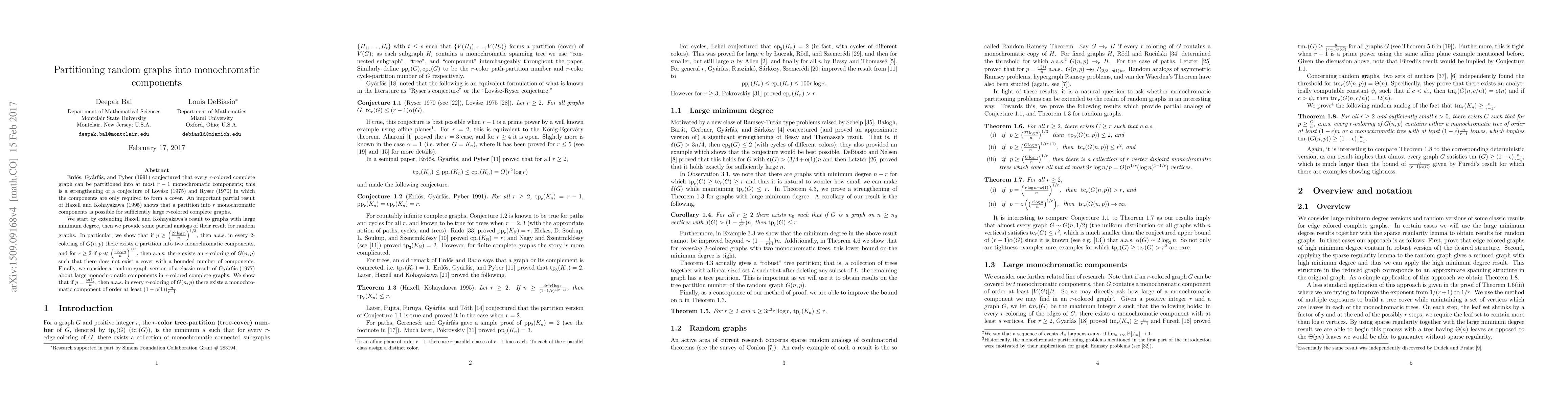 Erd\H{o}s, Gy\'arf\'as, and Pyber (1991) conjectured that every $r$-colored complete graph can be partitioned into at most $r-1$ monochromatic components; this is a strengthening of a conjecture of Lov\'asz (1975) in which the components are only required to form a cover. An important partial result of Haxell and Kohayakawa (1995) shows that a partition into $r$ monochromatic components is possible for sufficiently large $r$-colored complete graphs. We start by extending Haxell and Kohayakawa's result to graphs with large minimum degree, then we provide some partial analogs of their result for random graphs. In particular, we show that if $p\ge \left(\frac{27\log n}{n}\right)^{1/3}$, then a.a.s. in every $2$-coloring of $G(n,p)$ there exists a partition into two monochromatic components, and for $r\geq 2$ if $p\ll \left(\frac{r\log n}{n}\right)^{1/r}$, then a.a.s. there exists an $r$-coloring of $G(n,p)$ such that there does not exist a cover with a bounded number of components. Finally, we consider a random graph version of a classic result of Gy\'arf\'as (1977) about large monochromatic components in $r$-colored complete graphs. We show that if $p=\frac{\omega(1)}{n}$, then a.a.s. in every $r$-coloring of $G(n,p)$ there exists a monochromatic component of order at least $(1-o(1))\frac{n}{r-1}$.