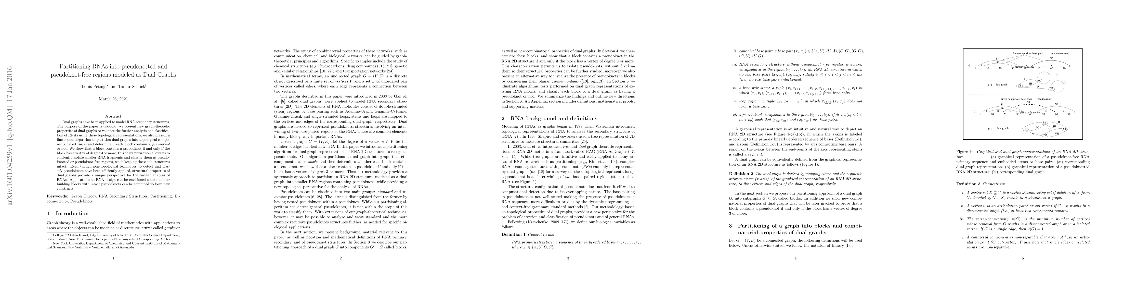 This research introduces new graph-theoretic properties of dual graphs for RNA secondary structure modeling. A linear-time algorithm partitions these graphs into topological components, identifying pseudoknotted or pseudoknot-free regions, which could aid in RNA design by enabling the creation of modular structures with intact pseudoknots.