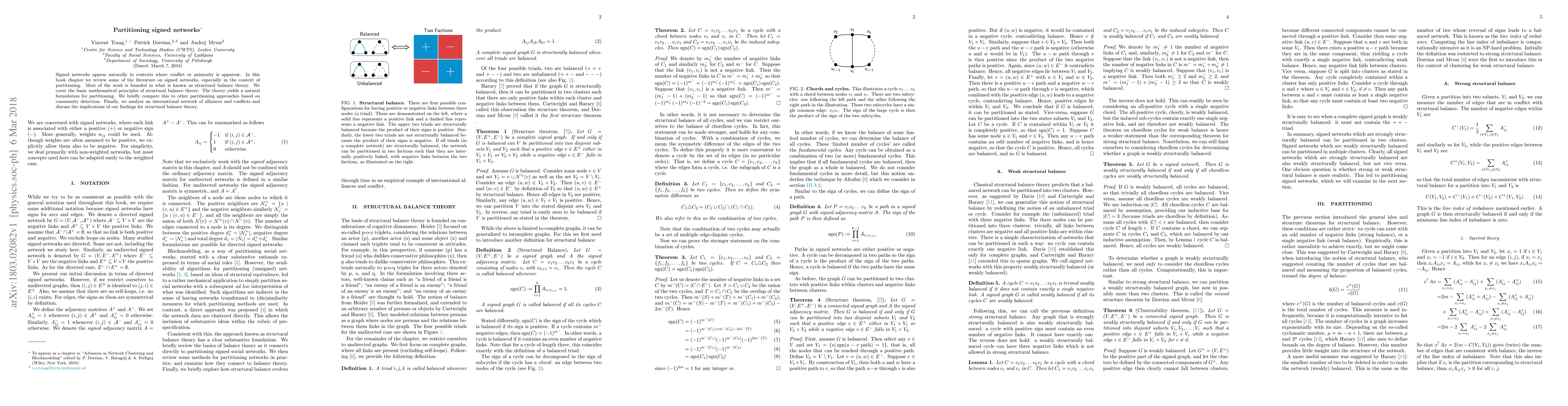 Signed networks appear naturally in contexts where conflict or animosity is apparent. In this book chapter we review some of the literature on signed networks, especially in the context of partitioning. Most of the work is founded in what is known as structural balance theory. We cover the basic mathematical principles of structural balance theory. The theory yields a natural formulation for partitioning. We briefly compare this to other partitioning approaches based on community detection. Finally, we analyse an international network of alliances and conflicts and discuss the implications of our findings for structural balance theory.