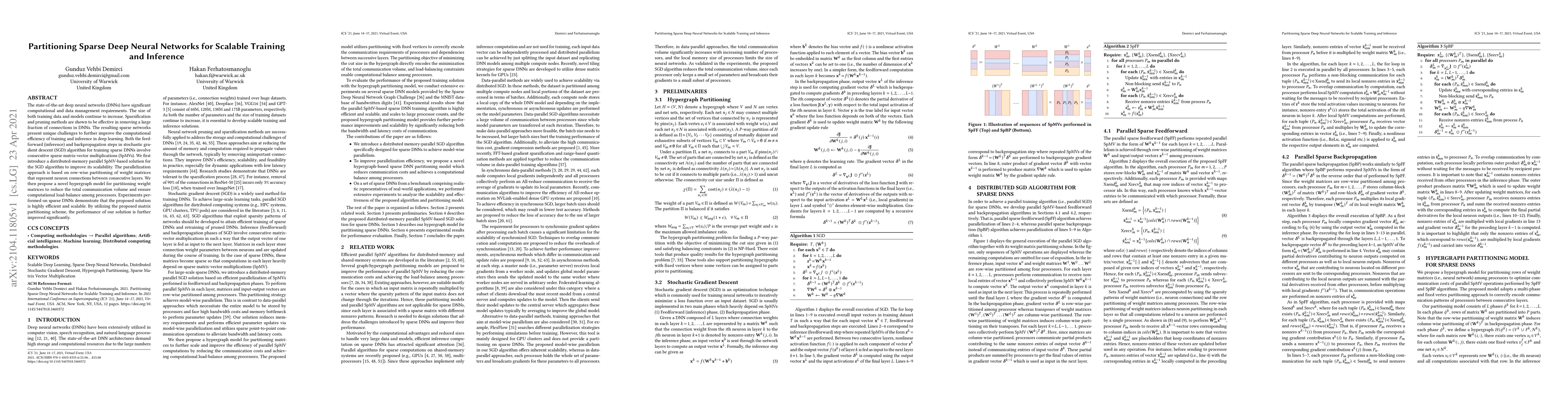 This paper proposes a distributed-memory parallel solution for scalable training and inference of sparse deep neural networks, focusing on optimizing sparse matrix-vector multiplications. It introduces a novel hypergraph model for partitioning weight matrices to reduce communication and ensure load-balance, demonstrating significant performance improvements.