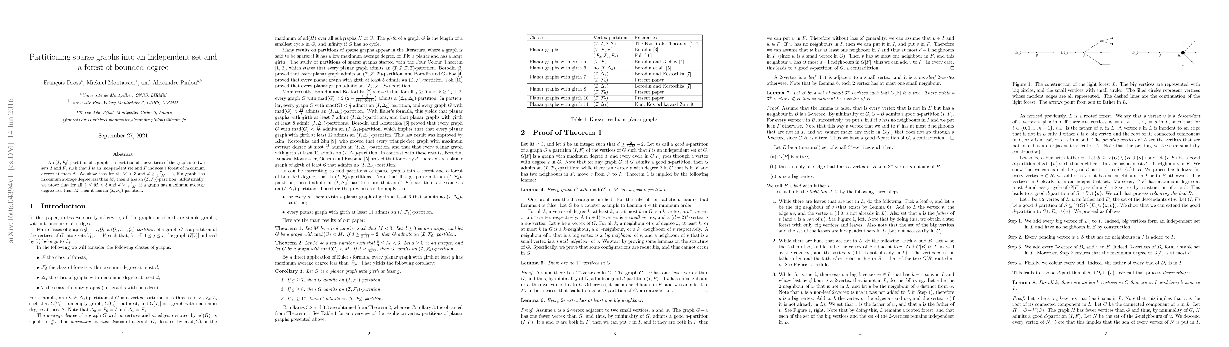 An $({\cal I},{\cal F}_d)$-partition of a graph is a partition of the vertices of the graph into two sets $I$ and $F$, such that $I$ is an independent set and $F$ induces a forest of maximum degree at most $d$. We show that for all $M<3$ and $d \ge \frac{2}{3-M} - 2$, if a graph has maximum average degree less than $M$, then it has an $({\cal I},{\cal F}_d)$-partition. Additionally, we prove that for all $\frac{8}{3} \le M < 3$ and $d \ge \frac{1}{3-M}$, if a graph has maximum average degree less than $M$ then it has an $({\cal I},{\cal F}_d)$-partition.