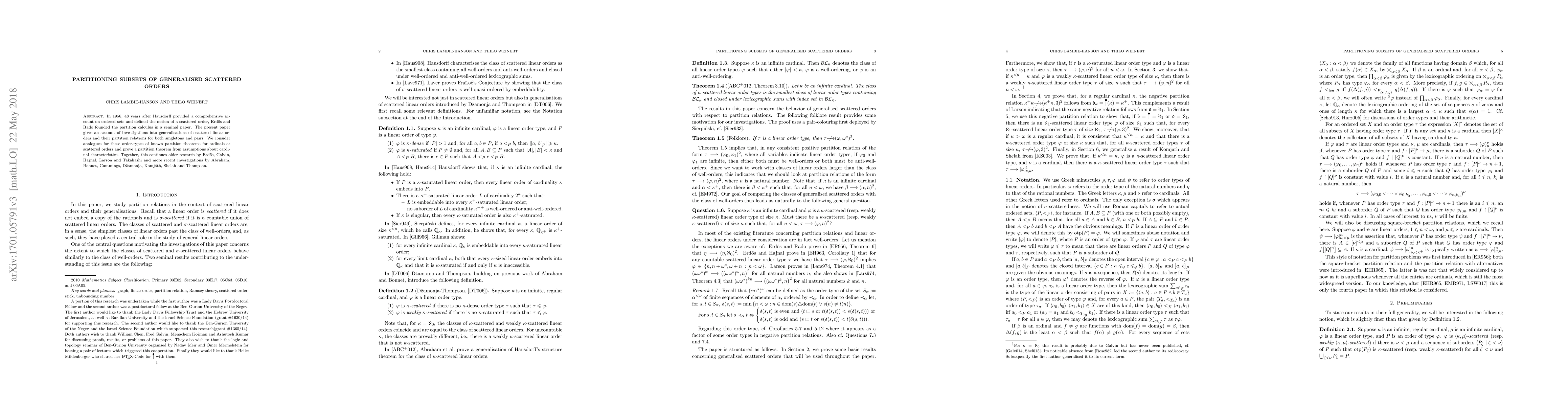 In 1956, 48 years after Hausdorff provided a comprehensive account on ordered sets and defined the notion of a scattered order, Erd\H{o}s and Rado founded the partition calculus in a seminal paper. The present paper gives an account of investigations into generalisations of scattered linear orders and their partition relations for both singletons and pairs. It provides analogues of the Milner-Rado paradox for these orders instead of ordinals. For infinite, regular $\kappa$, we investigate the extent to which the classes of $\kappa$-scattered, weakly $\kappa$-scattered, and $\kappa$-saturated linear orders of size $\kappa$ are closed under the partition relation $\tau \rightarrow (\varphi, n)^2$ for all $n < \omega$. We prove that for a regular cardinal $\kappa$ such that the stick principle holds at $\kappa$ and $\mathfrak{b}_\kappa = \kappa^+$, the partition relation $\kappa^+\kappa \rightarrow (\kappa^+\kappa, 3)^2$ fails. Finally we generalise a result of Komj\'{a}th and Shelah about partitions of scattered linear orders to a similar result about partitions of $\kappa$-scattered linear orders for uncountable $\kappa$. Together this continues older research by Erd\H{o}s, Galvin, Hajnal, Larson and Takahashi and more recent investigations by Abraham, Bonnet, Cummings, D\v{z}amonja, Komj\'{a}th, Shelah and Thompson.